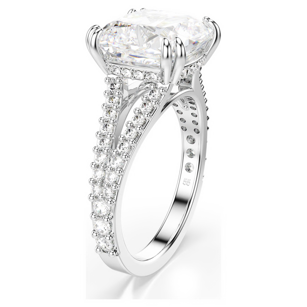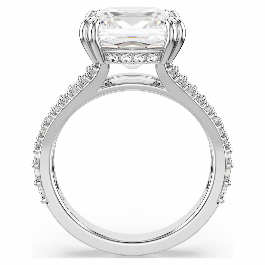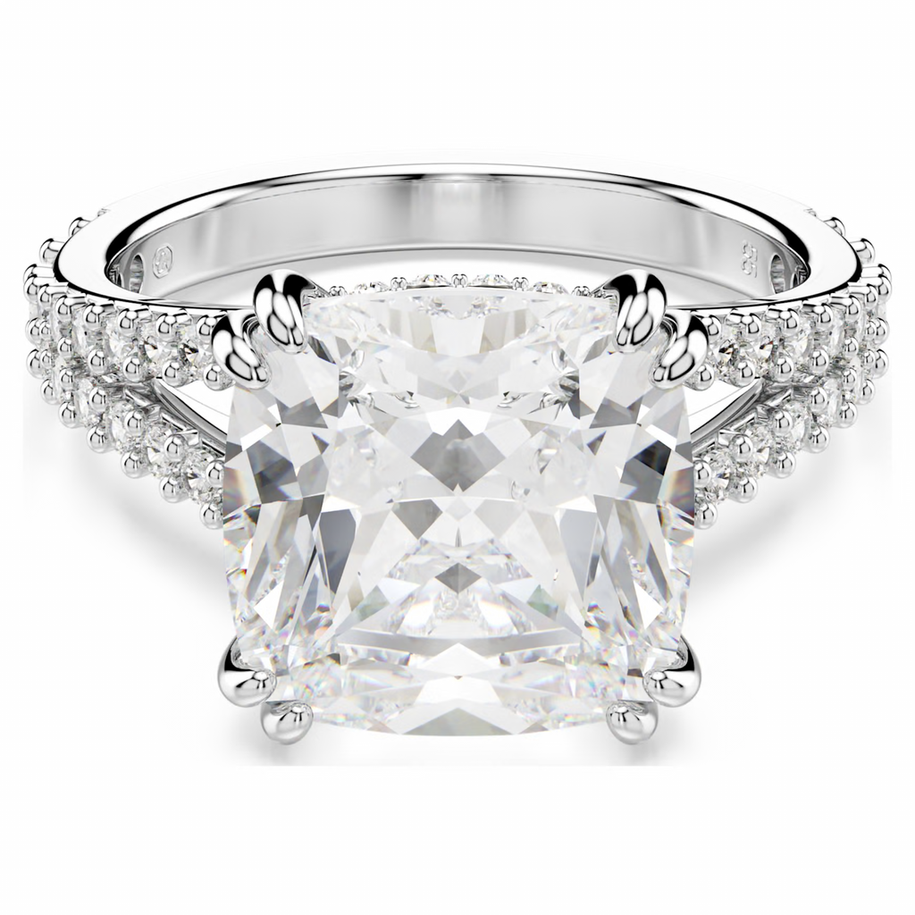 Questo affascinante anello cocktail della linea Stilla è nato per le luci della ribalta. Esibisce una squisita pietra taglio quadrato in una montatura a due griffe rifinita con una galleria impreziosita dal pavé e una fascia con finitura in tonalità argento e coglie alla perfezione il punto d’equilibrio tra spettacolarità e raffinatezza.