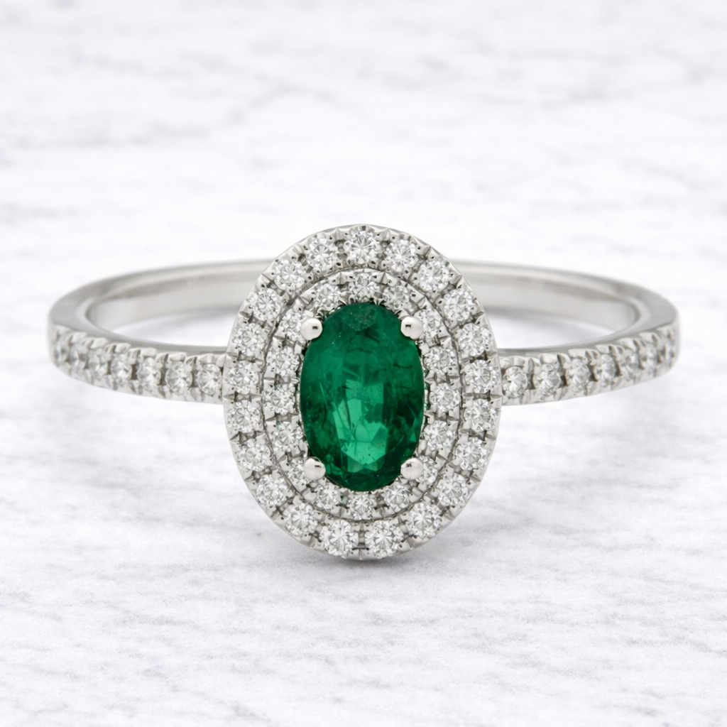 Un anello raffinato che unisce la profondità del verde alla luminosità dei diamanti. Realizzato in oro bianco 18kt (3,20 grammi), è impreziosito da splendidi smeraldi naturali per un totale di 0,35 carati, dal colore intenso e vibrante.