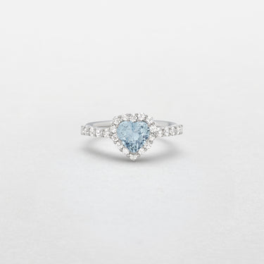 Protagonista assoluto è il cuore di acquamarina da 1.09 ct, dal colore celeste intenso e trasparente, simbolo di serenità, amore puro e protezione. Il taglio a cuore, raro e prezioso, rende questa pietra centrale una vera dichiarazione di stile e sentimento. Attorno all’acquamarina si sviluppa un contorno luminoso di diamanti taglio brillante, che abbraccia la pietra esaltandone i riflessi con grazia ed equilibrio.