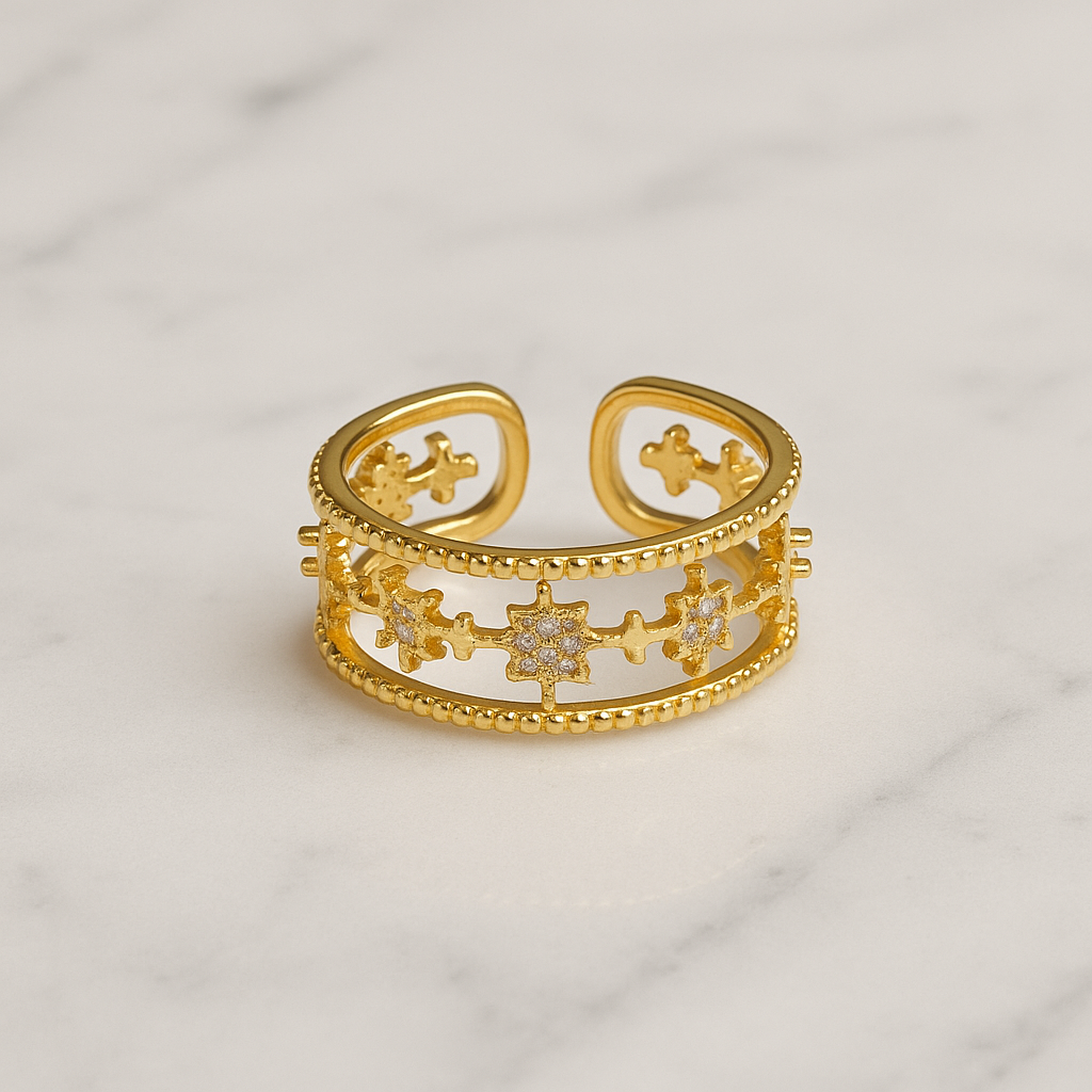 Questo anello è realizzato in argento 925 con finitura dorata, che conferisce calore e brillantezza al design. La fascia aperta, leggermente regolabile, presenta un’elegante lavorazione traforata impreziosita da piccoli motivi floreali e geometrici, decorati da zirconi bianchi incastonati con precisione per donare un effetto scintillante ma raffinato.