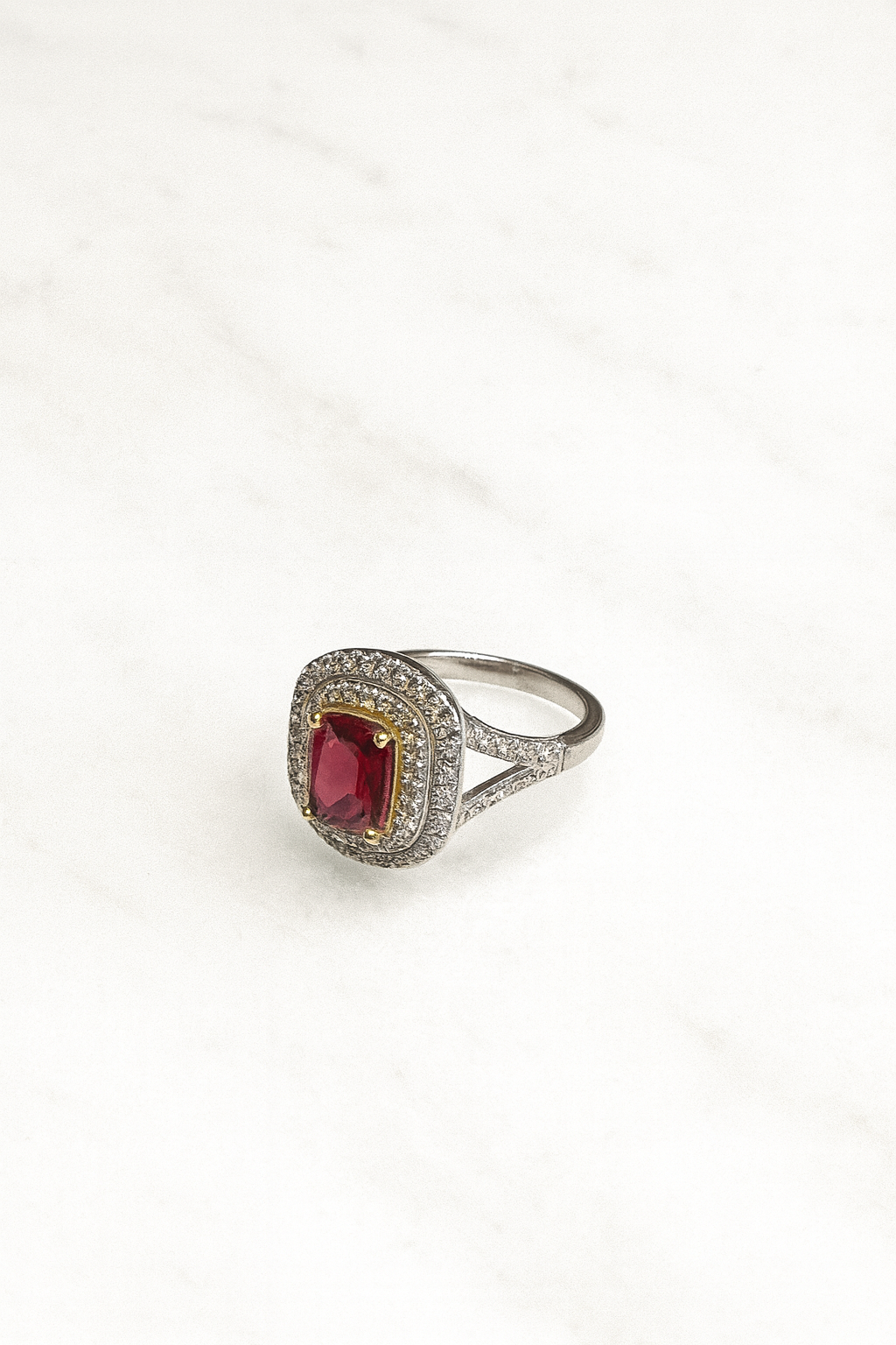 L’Anello Ruby Flame in Argento 925 è un gioiello che racchiude l’essenza della passione e del fascino senza tempo. Al centro, una pietra rossa dal taglio rettangolare sprigiona una luce intensa e profonda, simbolo di amore, forza e vitalità. È incastonata in una doppia cornice di zirconi bianchi che ne esaltano la brillantezza, arricchita da sottili dettagli dorati che donano calore e contrasto.