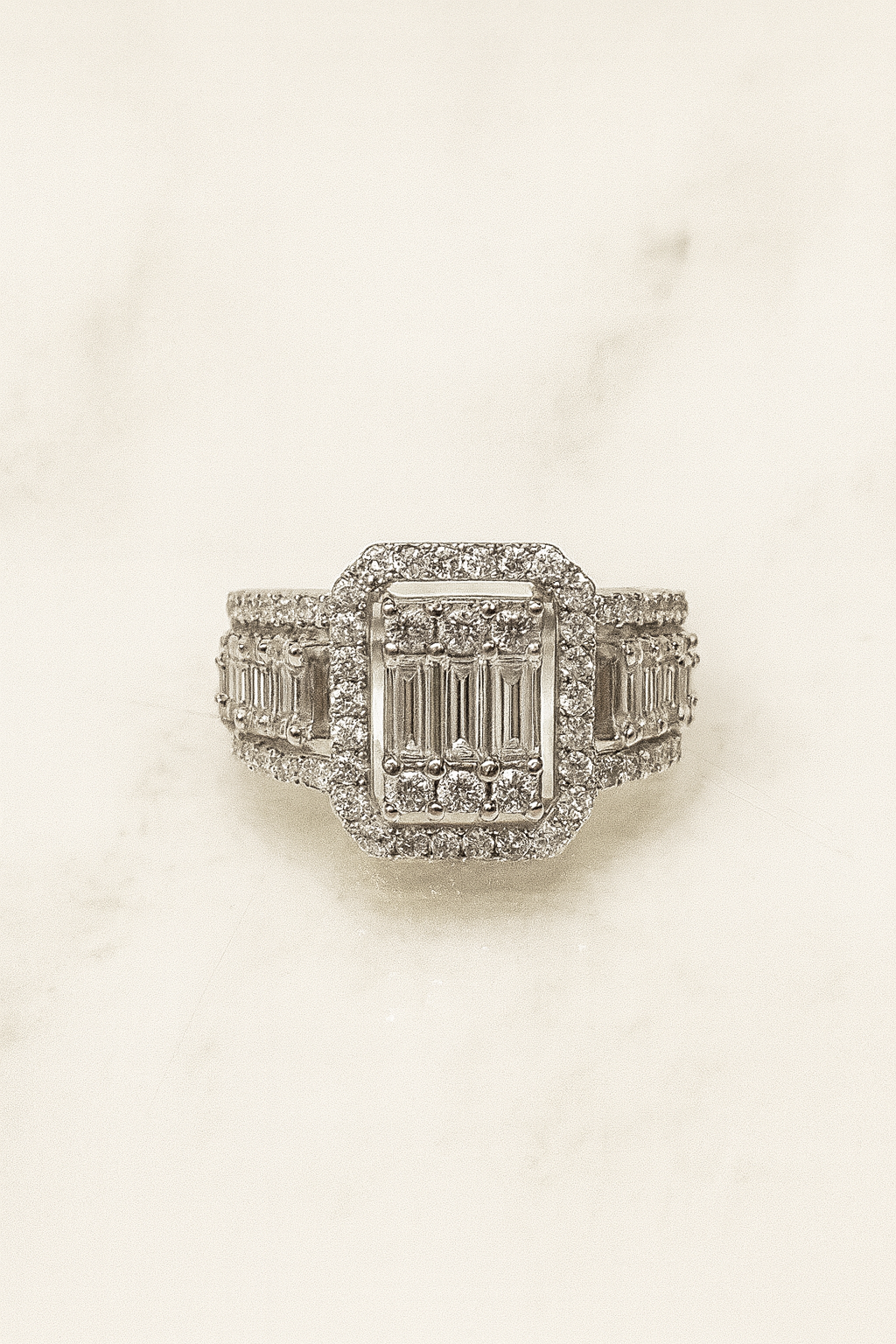 Un gioiello che unisce la tradizione del trilogy – simbolo di amore passato, presente e futuro – con l’eleganza moderna del taglio baguette, rendendolo ideale per un look sofisticato o come dono dal profondo significato. ✨💫