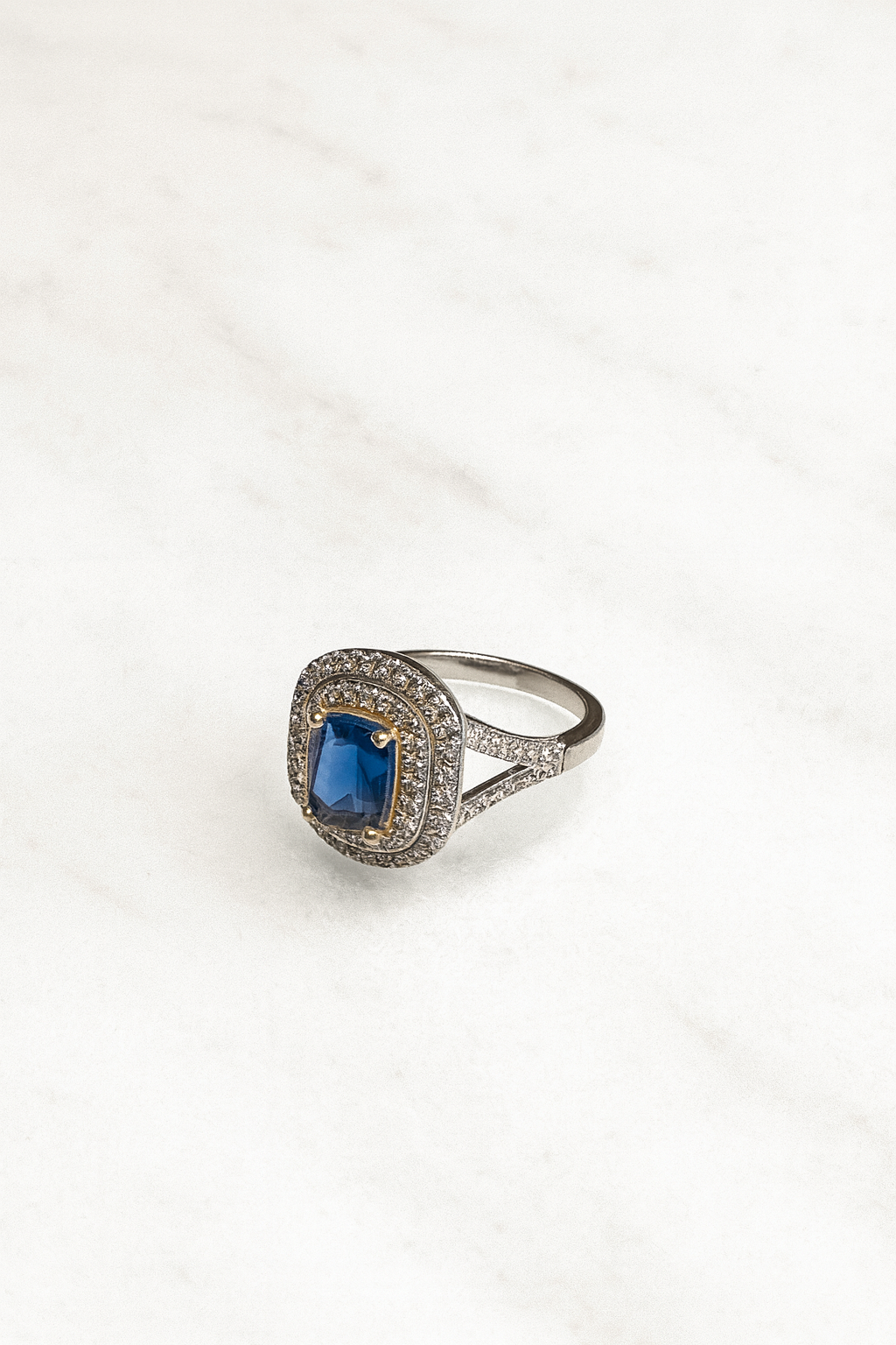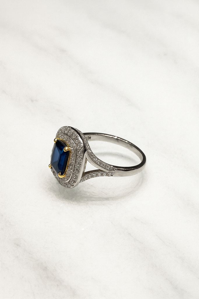 L’Anello Blue Radiance in Argento 925 è un gioiello che incarna eleganza e profondità, unendo la purezza dell’argento alla magia del colore. Al centro risplende una pietra blu intenso dal taglio rettangolare, incastonata in una doppia cornice di zirconi bianchi, impreziosita da sottili dettagli dorati che ne esaltano la luminosità.