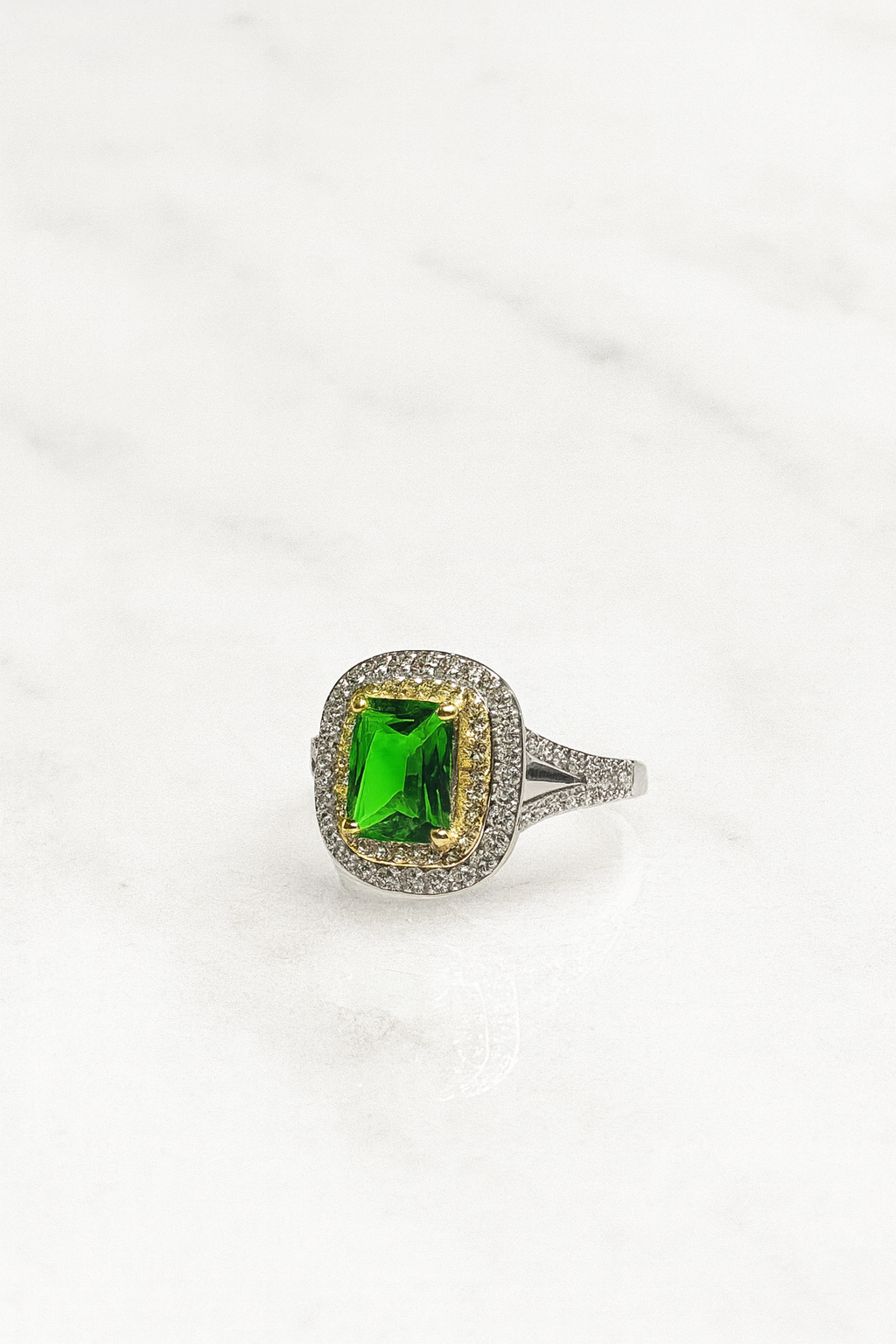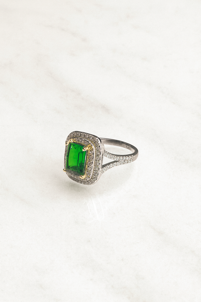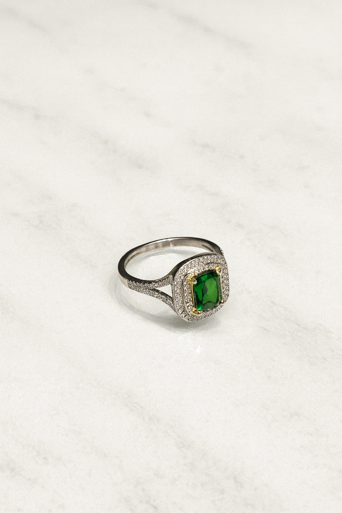 Raffinato, luminoso e intriso di fascino, l’Anello Emerald Glow in Argento 925 è un gioiello che non passa inosservato. La sua protagonista è una pietra verde intensa dal taglio rettangolare, incastonata con precisione in una cornice di zirconi bianchi che ne amplificano la brillantezza. Un sottile profilo dorato aggiunge un tocco di calore e raffinatezza, creando un perfetto equilibrio tra eleganza classica e stile moderno.
