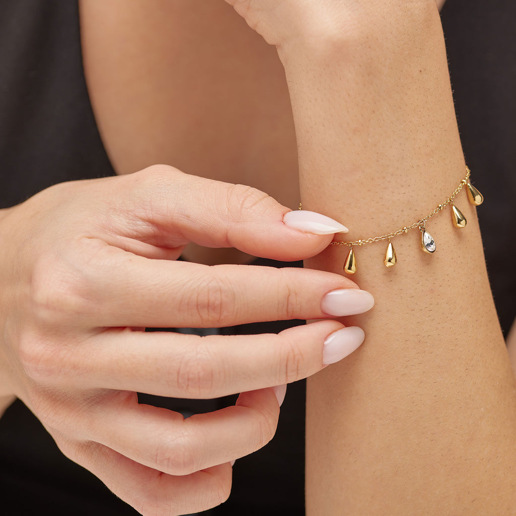 Bracciale da donna di Brosway della collezione Perfect. Bracciale in acciaio 316L, di colore oro, con pendenti a goccia e cristallo. La misura è 180mm. La referenza è: BPC20