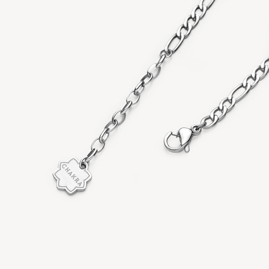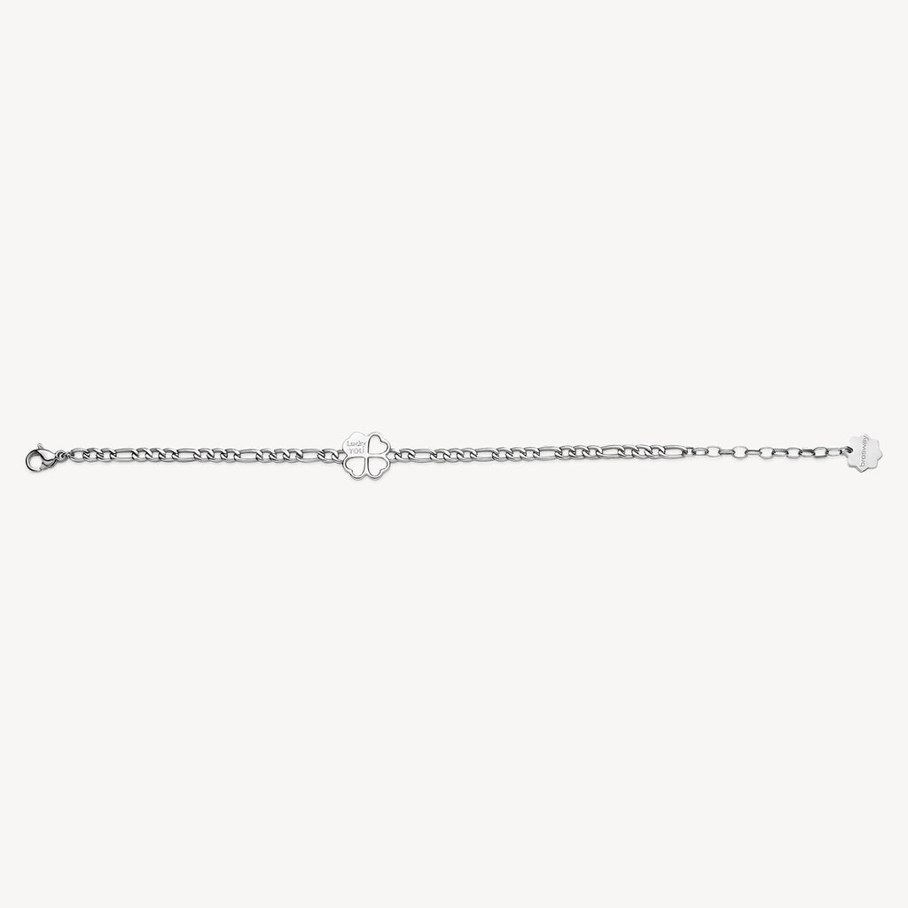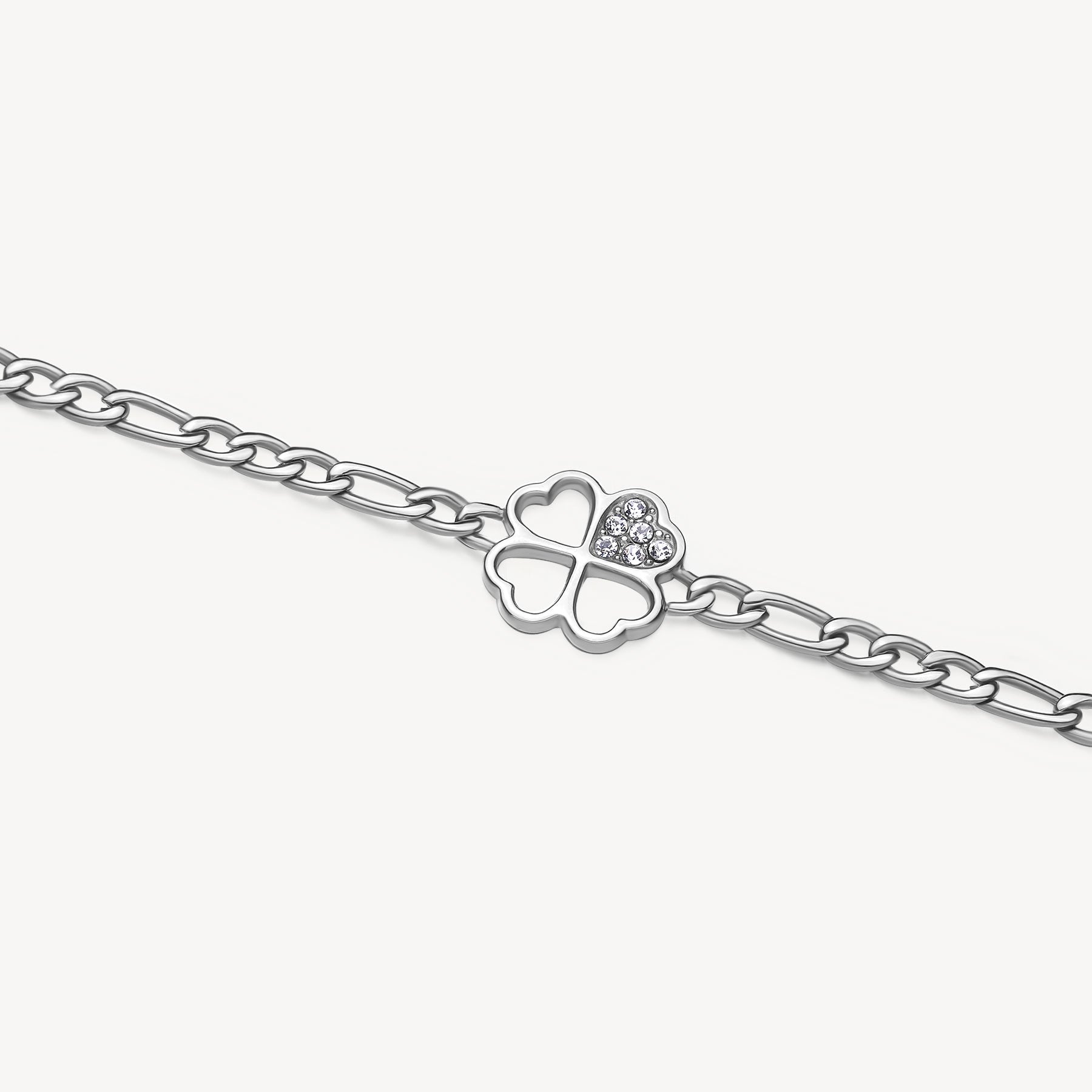 Il bracciale è realizzato in acciaio 316L, un materiale resistente e ipoallergenico, perfetto per essere indossato ogni giorno. La catena grumetta dona carattere e modernità, mentre i cristalli luminosi incastonati sul quadrifoglio aggiungono un tocco femminile ed elegante. Un perfetto equilibrio tra forza, simbolismo e delicatezza.