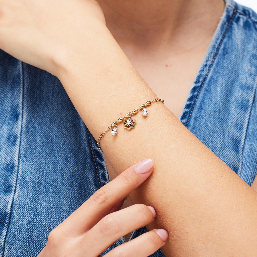 Realizzato in acciaio 316L, questo bracciale fiore di loto è resistente, anallergico e pensato per essere indossato ogni giorno. La raffinata finitura PVD oro 14K dona un tocco luminoso e senza tempo. I cristalli brillano con discrezione, valorizzando la figura del loto con eleganza e leggerezza. Il design è armonico, delicato ma deciso, ideale per chi ama unire spiritualità e moda.