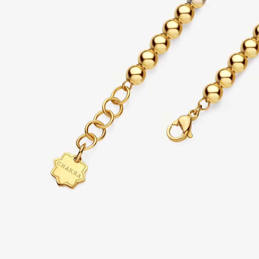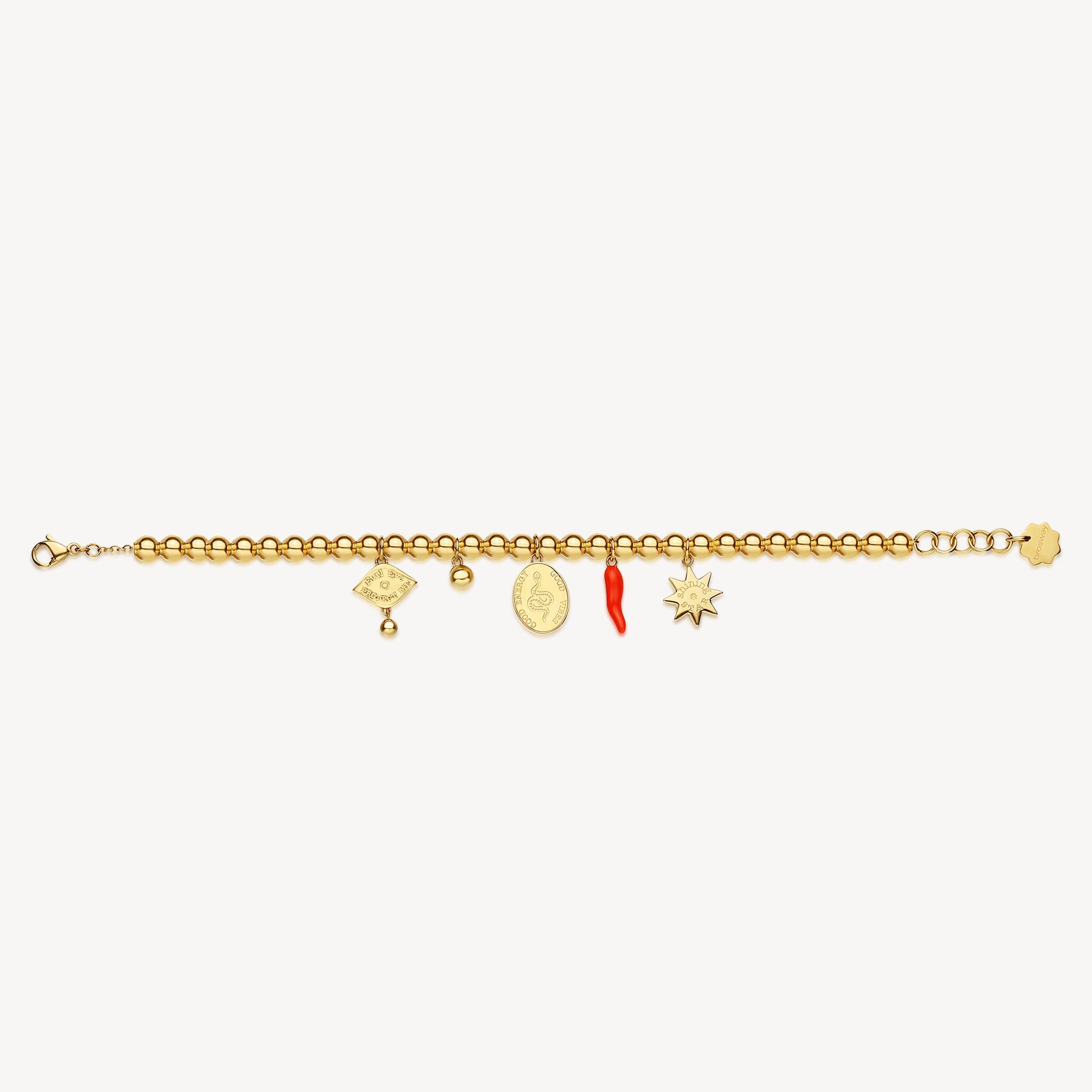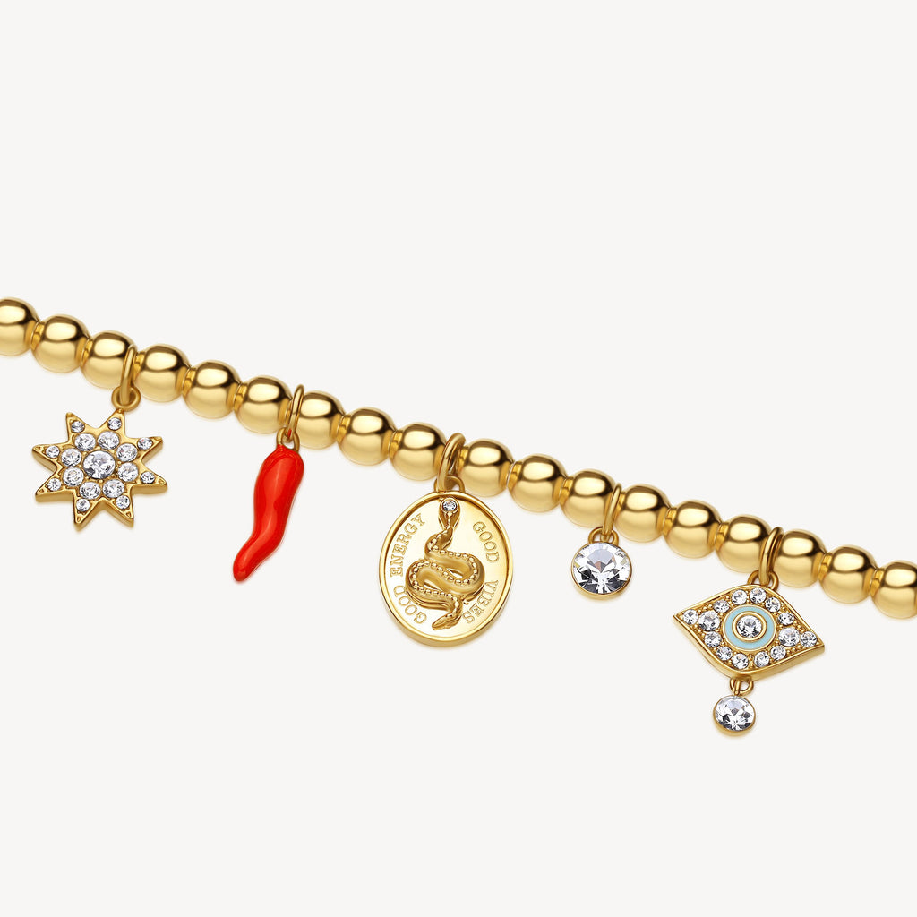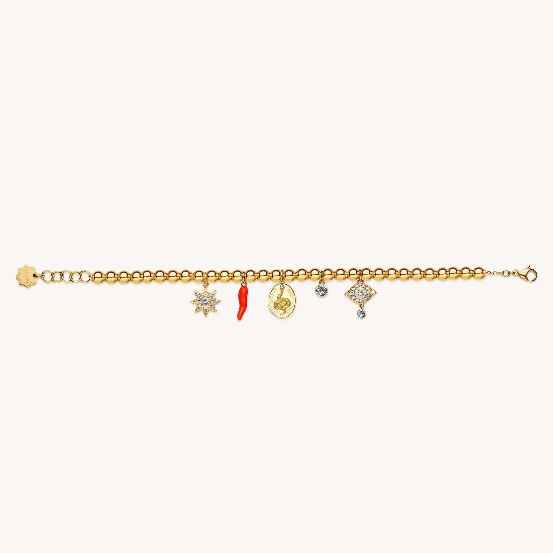 Bracciale con sfere in acciaio 316L e finitura pvd oro 14K con ciondolo con incisione a forma di serpente, occhio con smalto celeste, cornetto con smalto rosso, stella e cristalli.