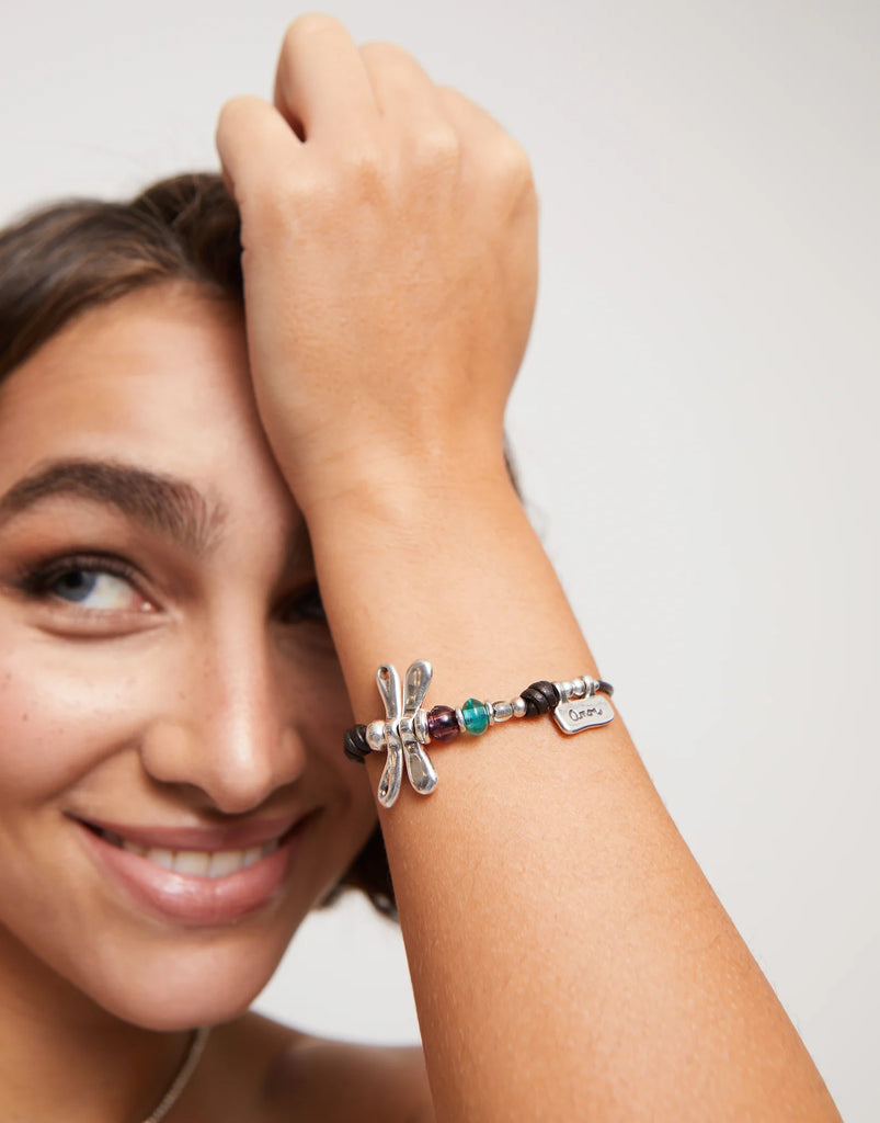Il Bracciale con libellula placcato argento sterling e cristalli artigianali sfaccettati della collezione Ser Rebelde è un piccolo manifesto di libertà personale. Composto da elementi in pelle multicolore, questo bracciale racchiude l’anima di chi osa vivere fuori dagli schemi. Al centro della scena, una libellula stilizzata placcata argento si trasforma in simbolo di trasformazione, leggerezza e indipendenza. Inciso sul metallo, il messaggio “Amor” aggiunge profondità emotiva, rendendo questo accessorio anche un augurio e una dichiarazione.