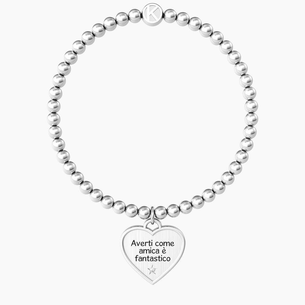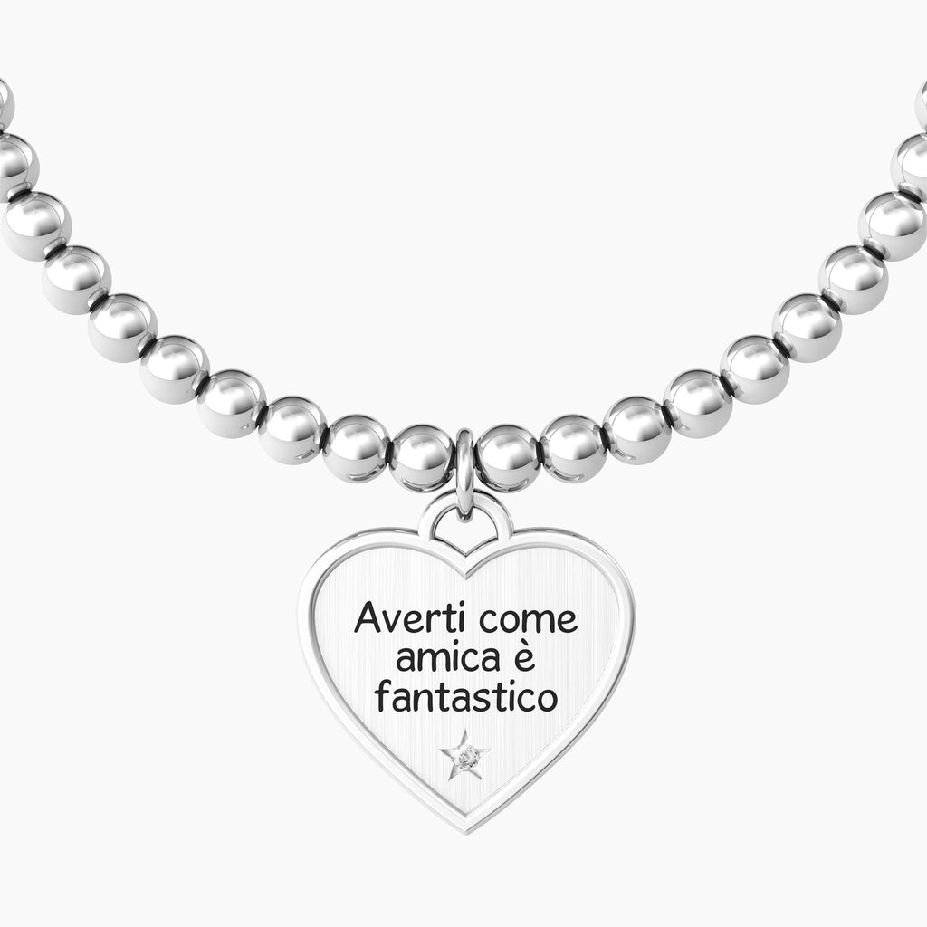 Il bracciale con frase 731945 è molto più di un semplice accessorio: è un gesto affettuoso, un messaggio da indossare ogni giorno per ricordare a un’amica quanto sia speciale. Composto da sfere in acciaio 316L dal diametro di 4 mm e arricchito da un ciondolo a forma di cuore satinato, questo gioiello celebra il legame più sincero con una frase che colpisce al cuore: “Averti come amica è fantastico”. L’incisione smaltata e il cristallo incastonato donano luce e carattere al ciondolo, trasformandolo in un gioiello con dedica perfetto per ogni occasione.