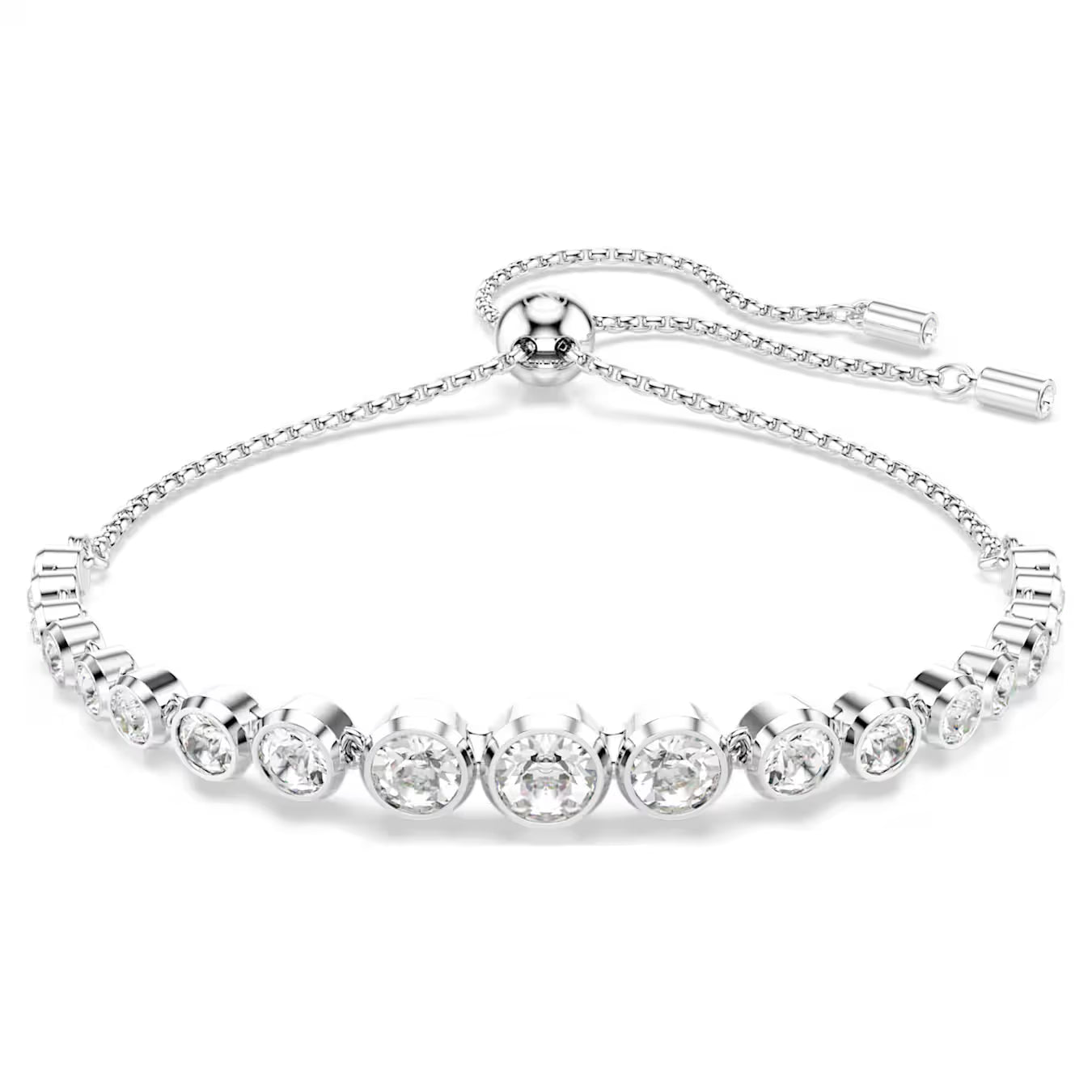Perfetto per un’eleganza da tutti i giorni, questo bracciale placcato rodio incarna la semplicità della famiglia Imber. Il design presenta una gradazione di cristalli Cry taglio Round, ognuno incastonato in una moderna montatura a castone su una delicata catena, con una chiusura scorrevole per indossarlo con facilità. Ogni delicata goccia dona al polso una sofisticata luminosità, rendendolo un gioiello passepartout da sovrapporre con altre creazioni per un effetto giocoso.