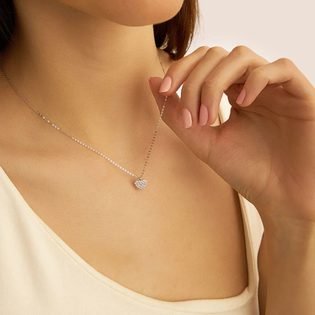 La Collana Cuore Claire Oro Bianco Cubic Zirconia è una dichiarazione di stile ed emozione, pensata per chi ama i gioielli raffinati con un tocco sentimentale. Realizzata in oro bianco 375/1000, presenta un elegante pendente a forma di cuore, simbolo universale d’amore e delicatezza. Il cuore è arricchito da 19 cubic zirconia bianchi, incastonati a pavé con taglio brillante tondo, per un effetto scintillante e raffinato che riflette la luce con ogni movimento.