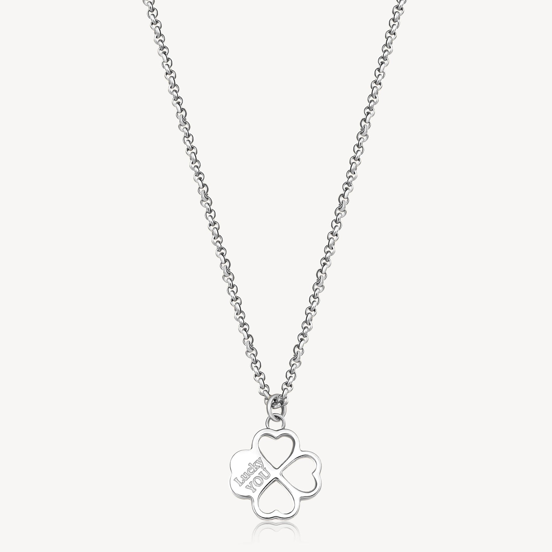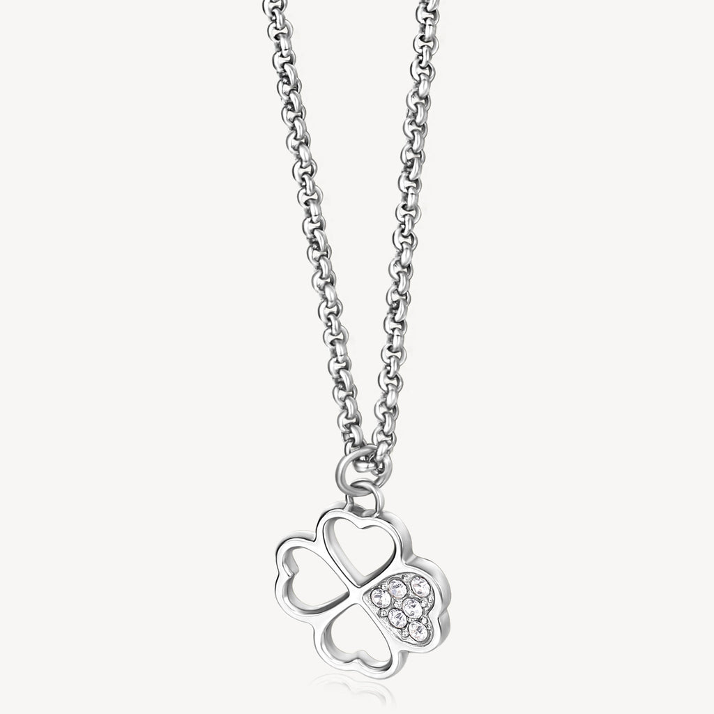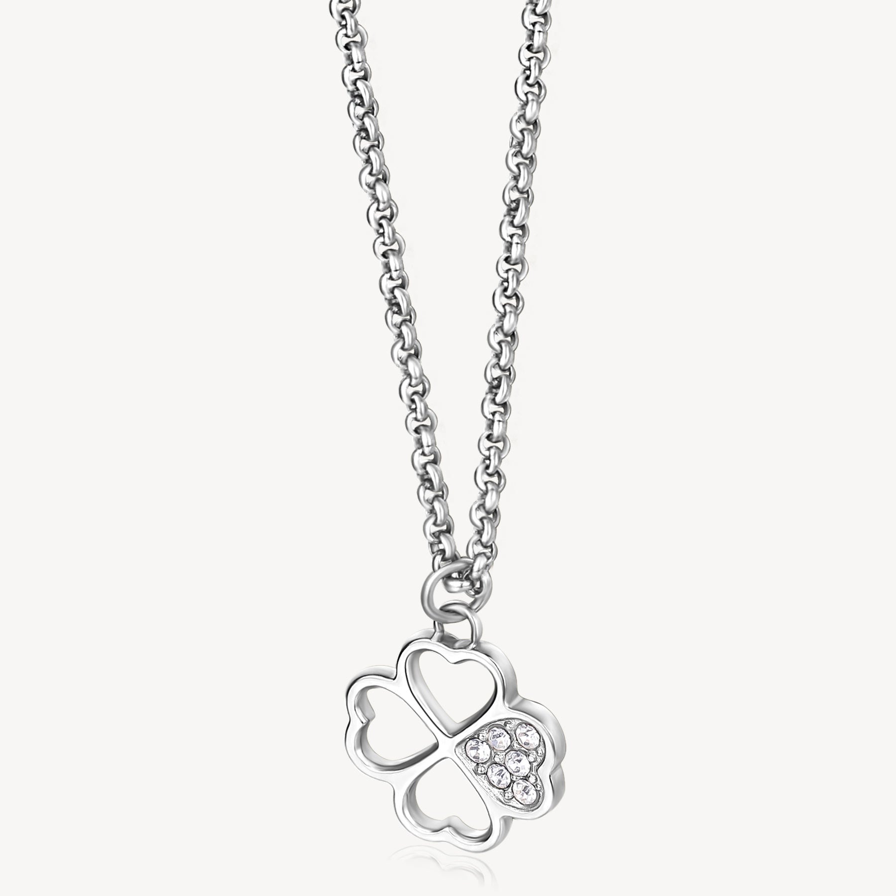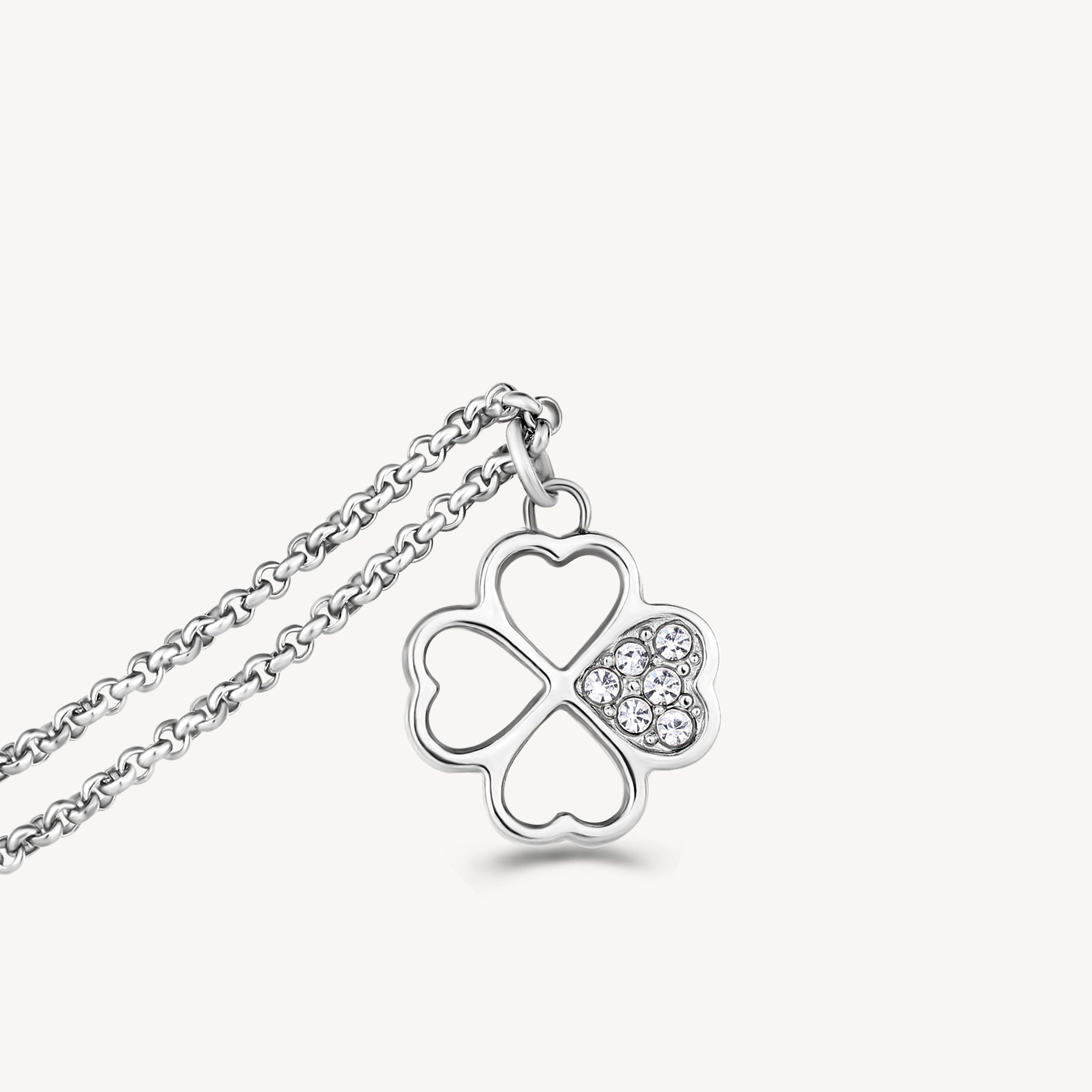 Collana girocollo in acciaio 316L con pendente a forma di quadrifoglio con cristalli.