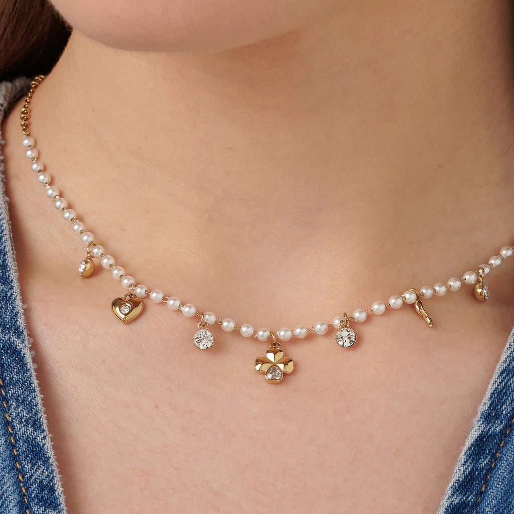Collana girocollo in acciaio 316L e perle di conchiglia, con finitura pvd oro 14K e pendenti a forma di quadrifoglio, cuore, cornetto e cristalli.