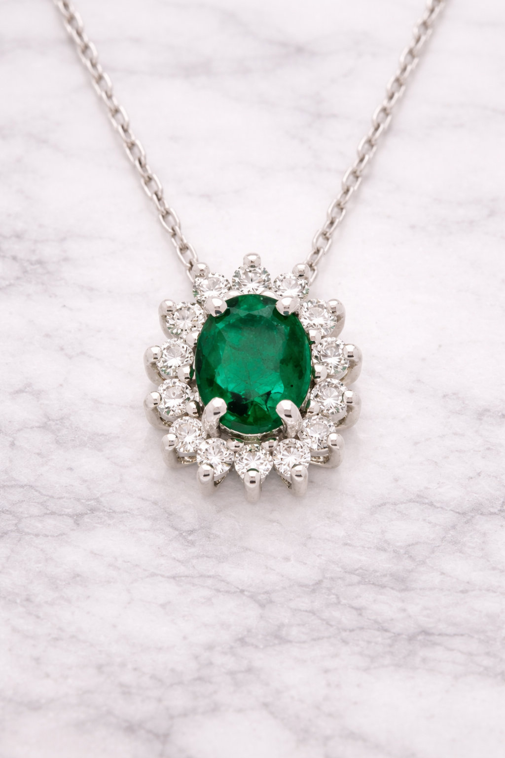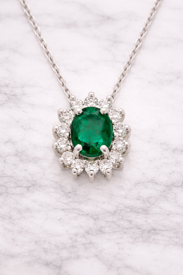 Lo smeraldo, simbolo di armonia ed eleganza, illumina il gioiello con il suo verde profondo, creando un contrasto raffinato con la luminosità dell’oro bianco e dei diamanti.