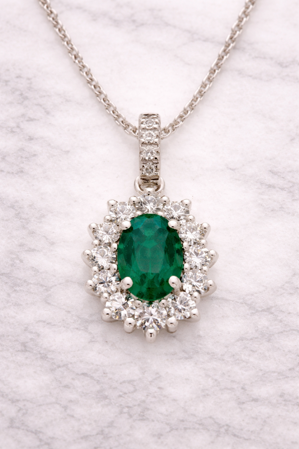 Lo smeraldo, simbolo di eleganza e armonia, impreziosisce il girocollo con la sua tonalità verde profonda, creando un contrasto raffinato con la brillantezza dell’oro bianco e dei diamanti.