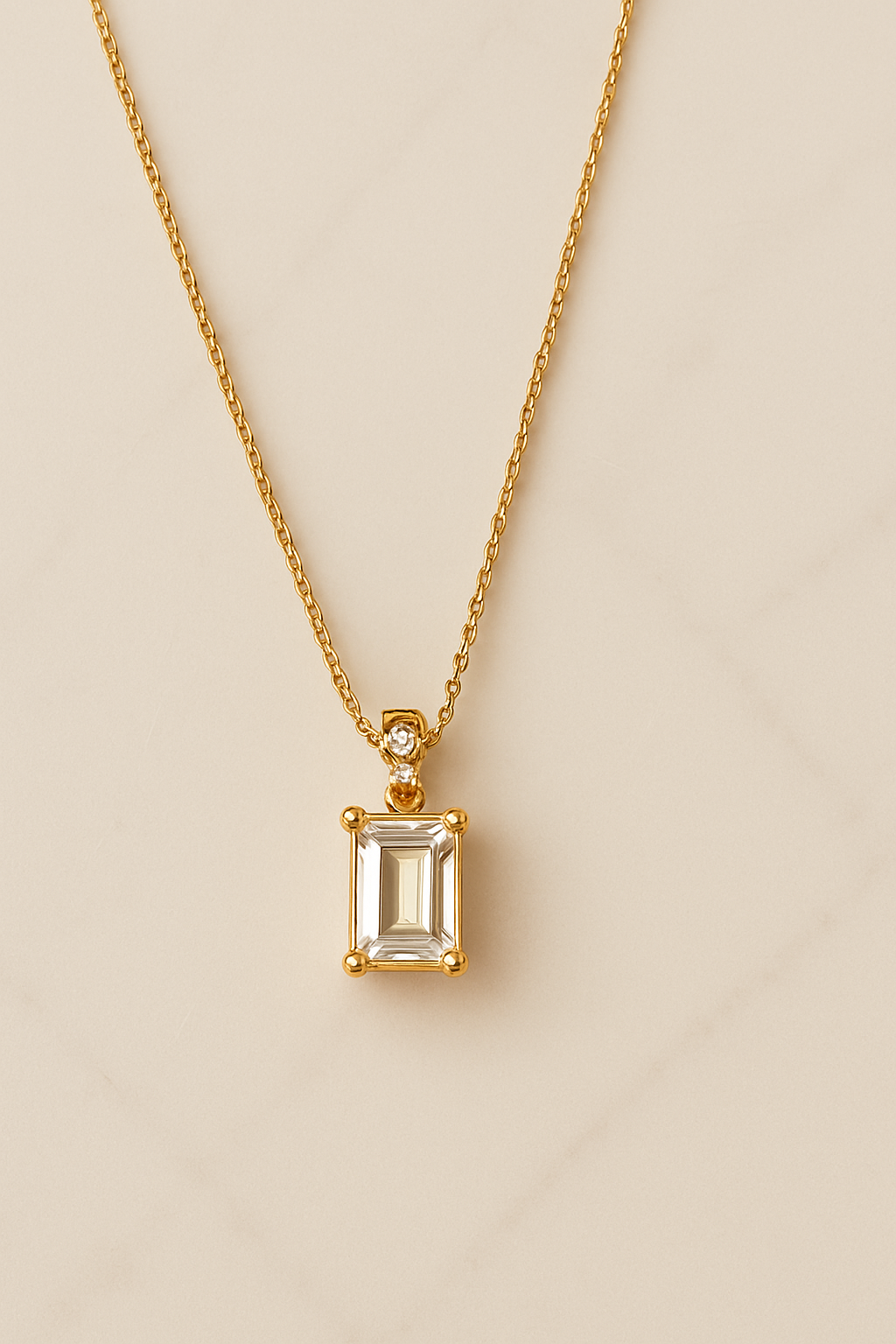 Raffinato e senza tempo, questo collier unisce la purezza dell’argento 925 e la luminosità della placcatura in oro a un pendente rettangolare dalle linee pulite e sofisticate. La pietra centrale taglio baguette cattura la luce con eleganza, donando un tocco di classe ad ogni look. Perfetto da indossare da solo per uno stile minimal chic, oppure abbinato ad altri gioielli per un effetto luminoso e contemporaneo.