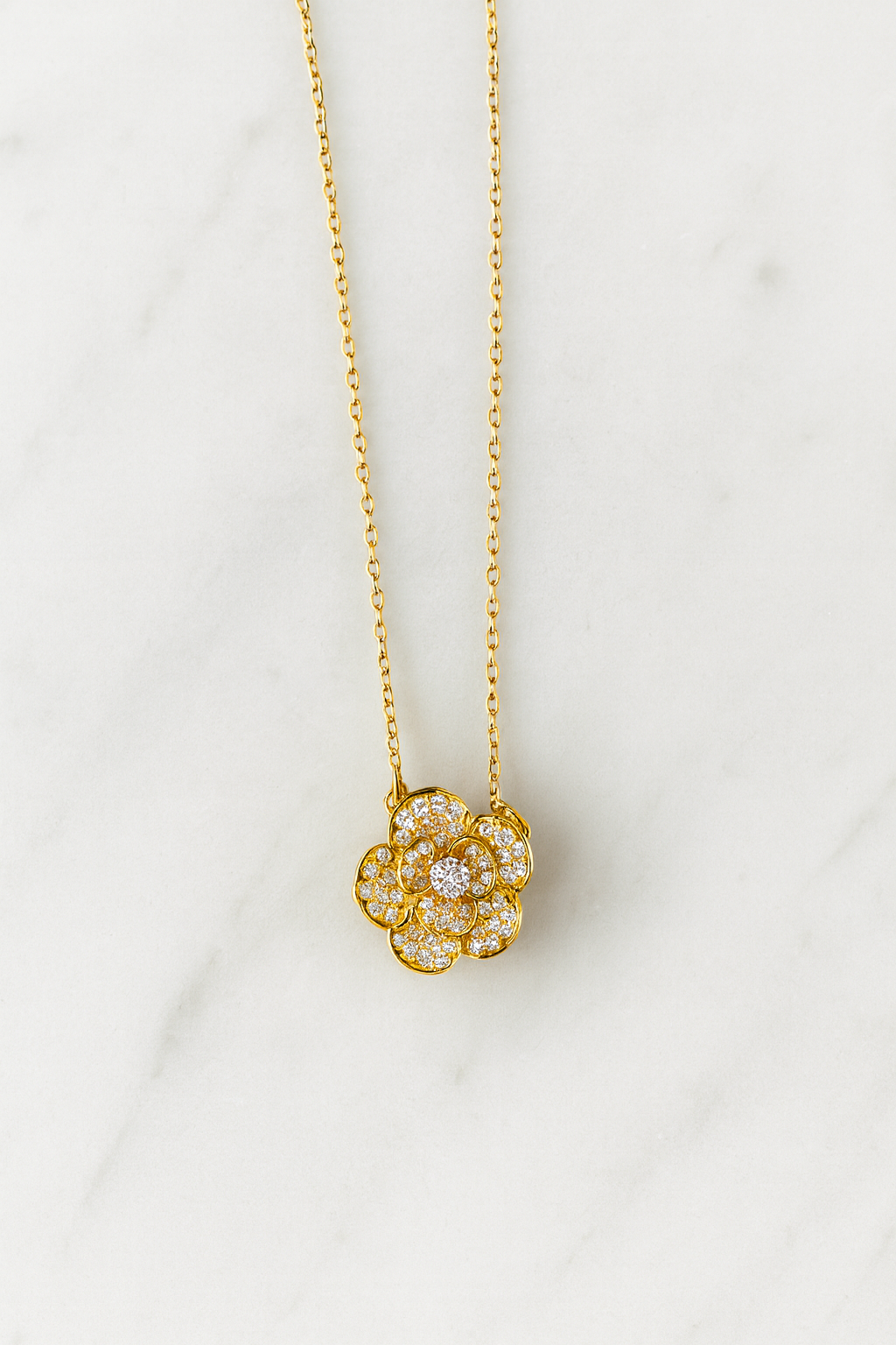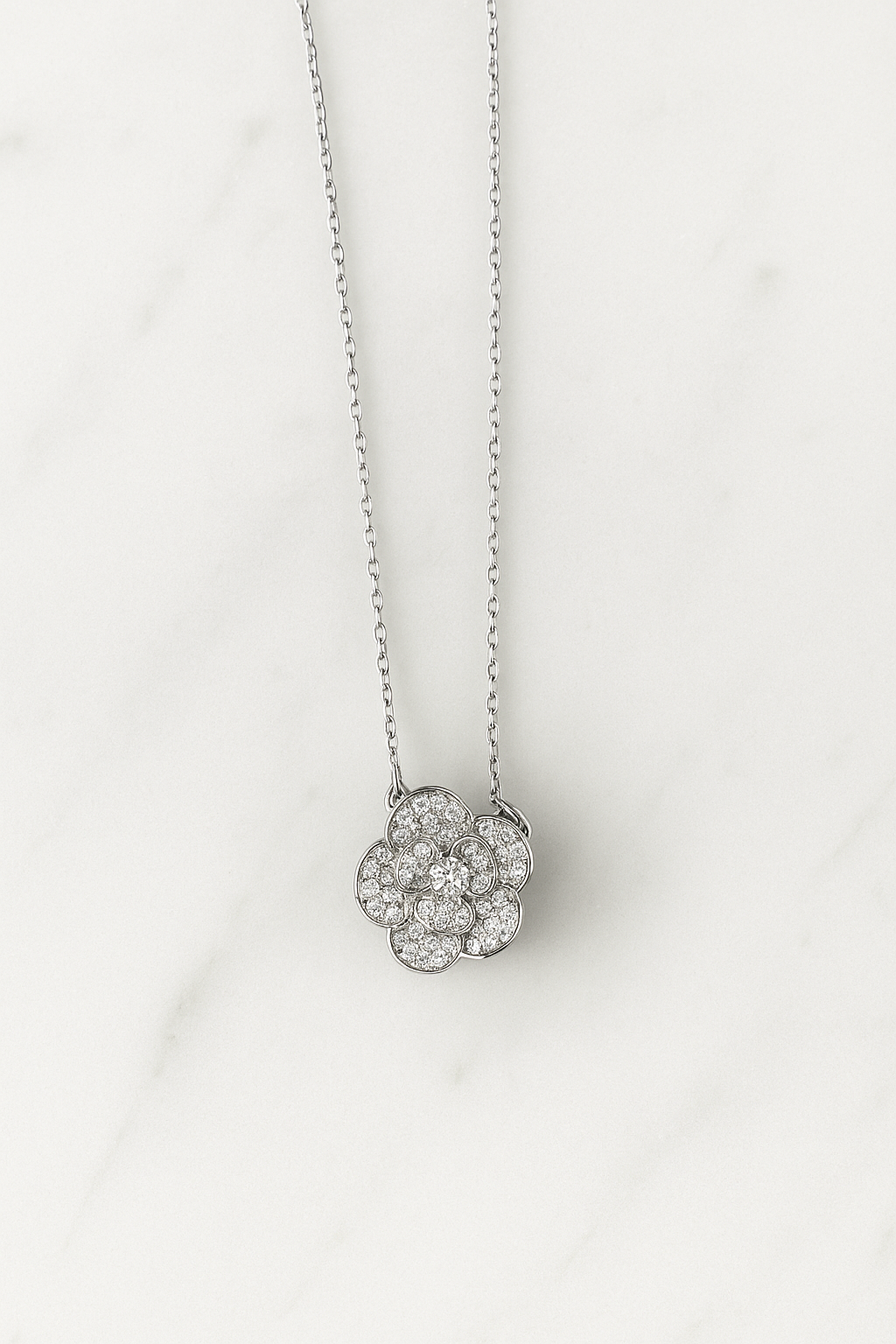 Il design a fiore, curato nei minimi particolari, crea un effetto tridimensionale raffinato e armonioso. La catena sottile valorizza il pendente, donando un equilibrio perfetto tra delicatezza e luminosità.