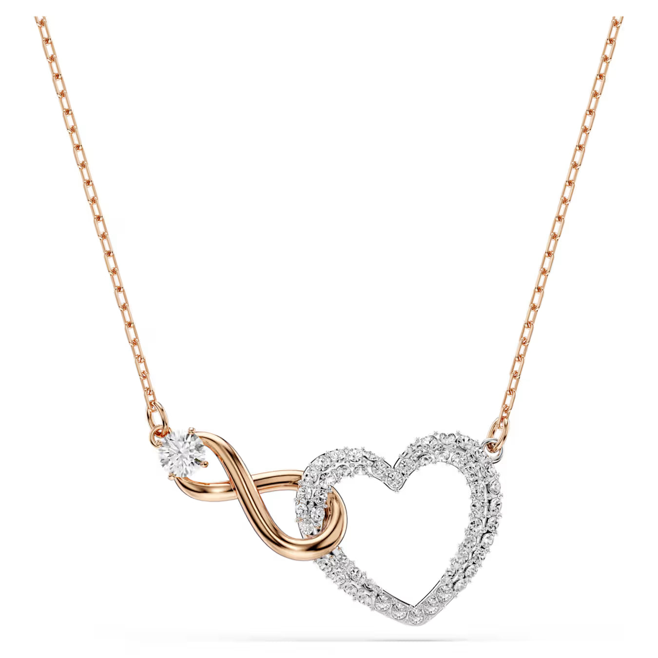 Eterno romanticismo: I simboli dell’amore e dell’infinito sono fusi insieme in questa elegante collana Swarovski. Un cuore in cristallo bianco è intrecciato con un simbolo dell’infinito placcato nella tonalità oro rosa in questo adorabile gioiello, una rappresentazione visiva della promessa di amore eterno. Un’idea regalo perfetta per la persona che ami.