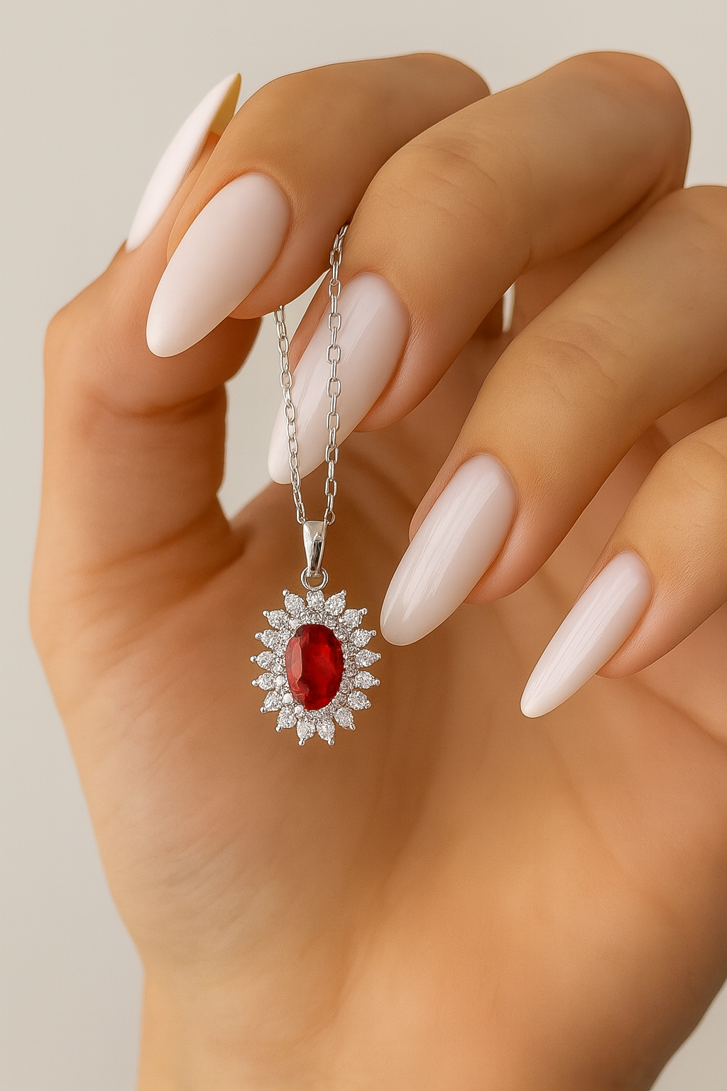La Collana Kate con pietra rossa è un gioiello dal fascino intenso e seducente, capace di catturare lo sguardo con la sua luminosità regale. Realizzata in argento 925, presenta un raffinato pendente con al centro una pietra rossa ovale, simbolo di passione ed eleganza senza tempo, impreziosita da una cornice di zirconi bianchi che donano un bagliore unico e raffinato.