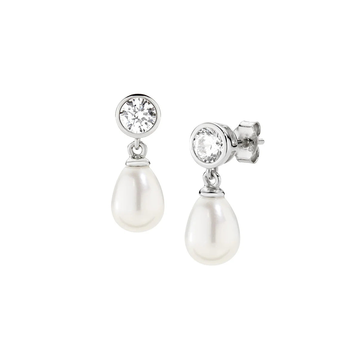 Orecchini pendenti in argento 925 rodiato con zircone punto luce taglio rotondo e perla a goccia di 7 mm. Lunghezza totale: 1,8 cm. Chiusura a farfallina.