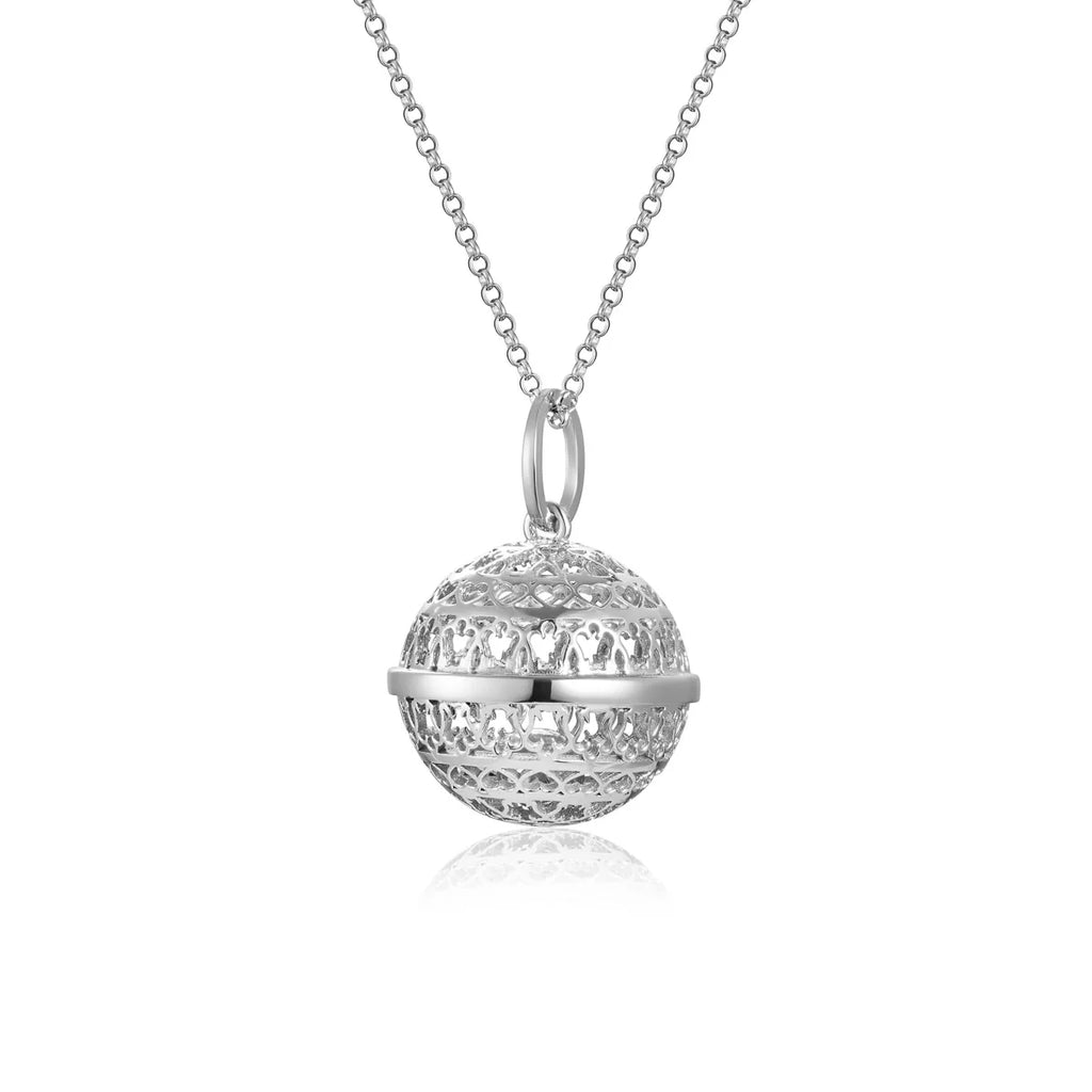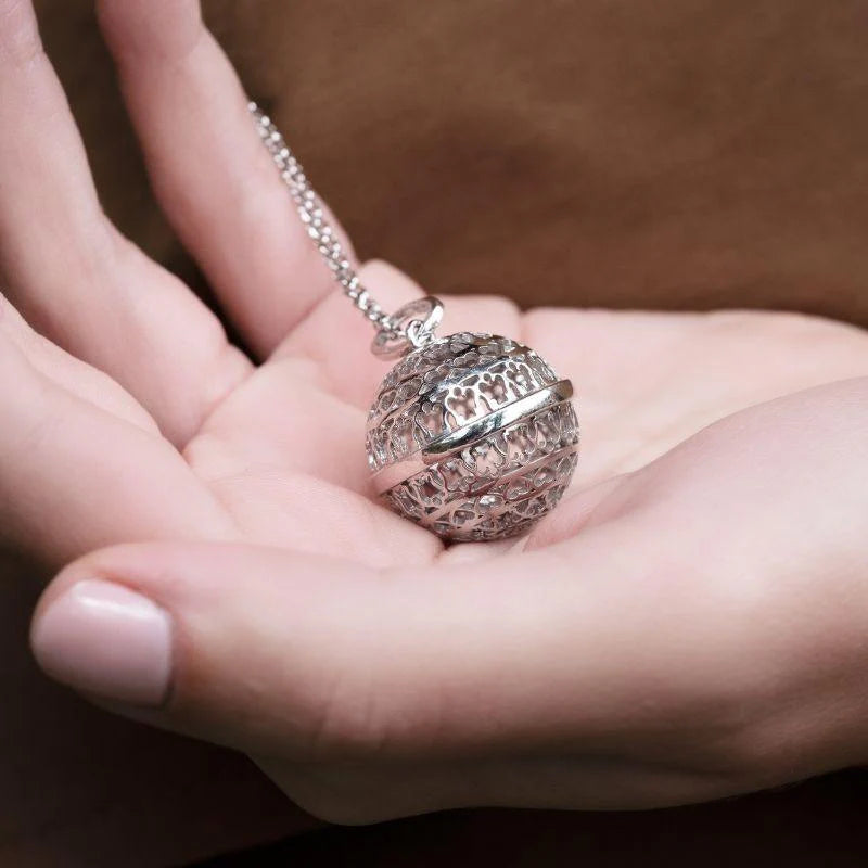 Questa collana Chiama Angeli in argento è interamente realizzata in argento 925, con una catena lunga 90 cm, perfetta per indossare il pendente in prossimità del cuore o del pancione, nel caso di una donna in dolce attesa. Il diametro della sfera è di 2 cm, dimensione ideale per esprimere eleganza senza risultare invasiva.