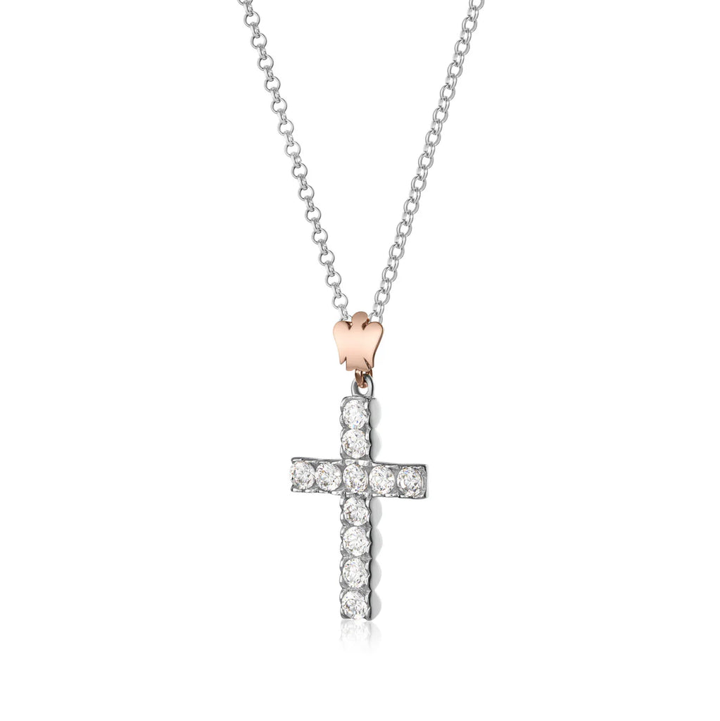 Collana Croce in Argento con Zirconi Bianchi e Angelo