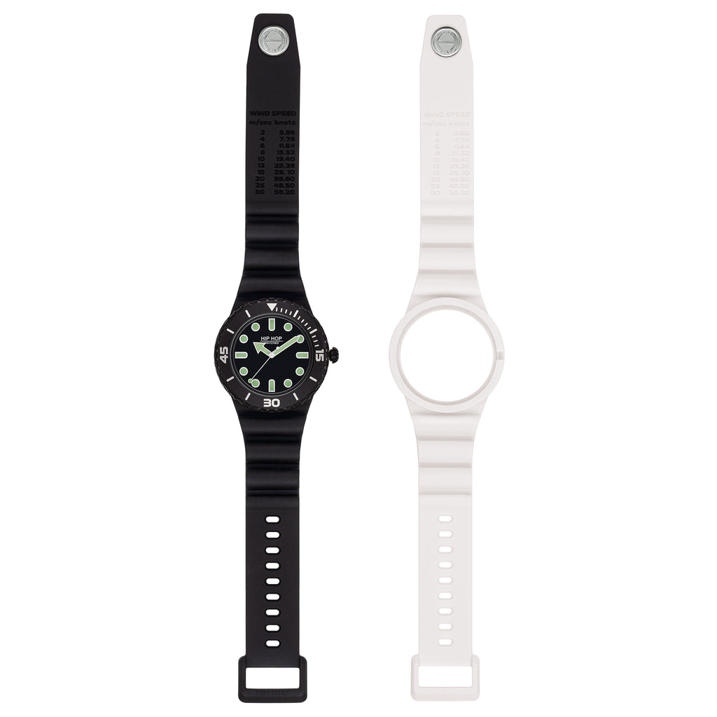 Il cinturino in silicone nero, morbido e resistente, è dotato di una pratica chiusura a fibbia .DOT ed è impreziosito da un dettaglio esclusivo: la scala Wind Speed incisa, che consente di convertire la velocità del vento da metri al secondo a nodi. Ma il vero punto di forza di questo orologio intercambiabile è la sua versatilità: nella confezione è incluso un secondo cinturino in silicone bianco, per trasformare completamente il look e adattarlo al tuo umore o al tuo outfit, in pochi secondi.