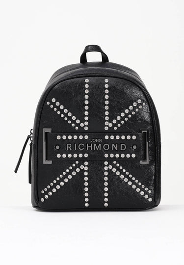 Il dettaglio che cattura subito l’attenzione è la reinterpretazione della bandiera britannica, resa attraverso una pioggia di borchie argentate che ne esaltano l’anima rock. Al centro, il logo John Richmond in rilievo è incorniciato da una placca con finiture metalliche scure, dettaglio che conferisce ulteriore grinta e unicità al modello. Questo mix di elementi estetici trasforma lo zaino in un vero statement di moda, ideale per completare look casual chic con un tocco audace.