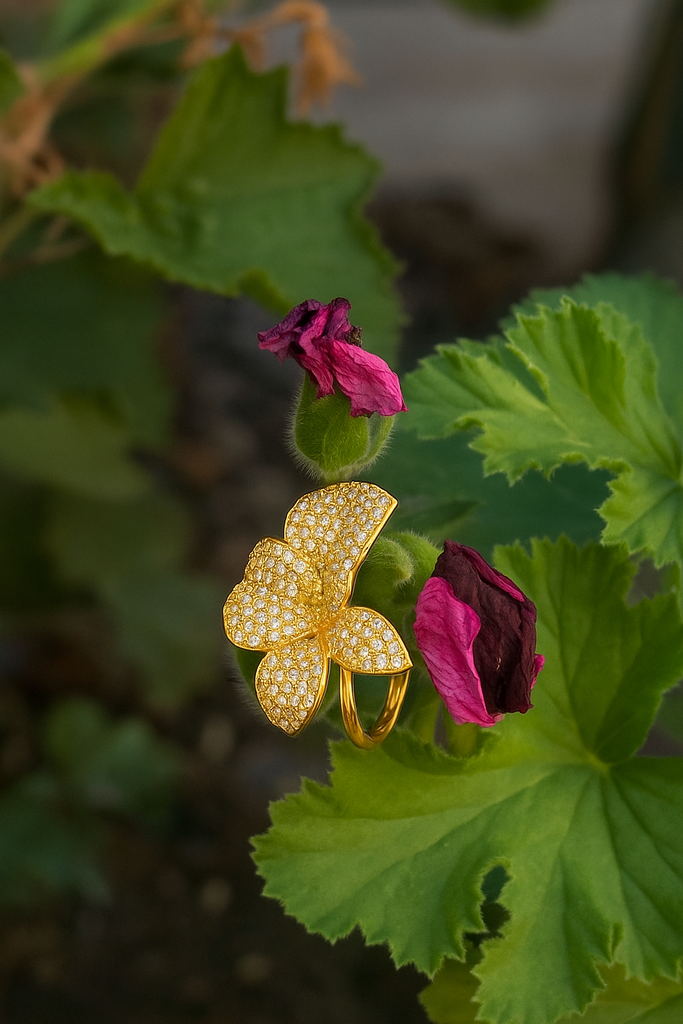 La base in argento 925 esalta la brillantezza delle decorazioni, mentre la disposizione armoniosa dei tre fiori dona movimento e luce alla mano. Un gioiello versatile, che si presta ad arricchire look quotidiani con un tocco elegante o a completare outfit più ricercati per le occasioni speciali.