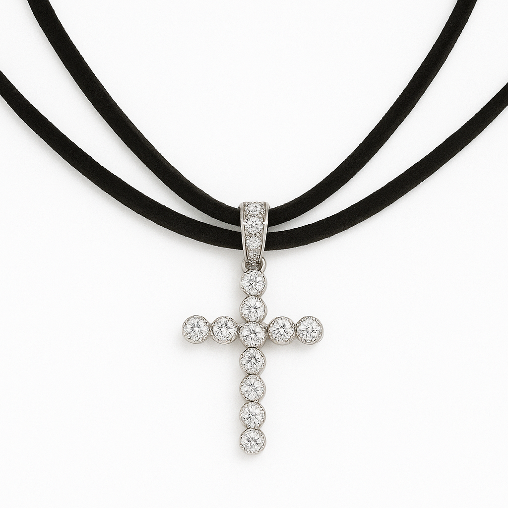 Questo choker rappresenta l’incontro perfetto tra carattere e femminilità. Realizzato con un laccetto nero elegante e moderno, si arricchisce di un ciondolo a forma di croce in argento 925, completamente rivestita da zirconi luminosi che creano un effetto pavé scintillante e sofisticato. Un gioiello che esprime forza, fede e stile in un’unica creazione.