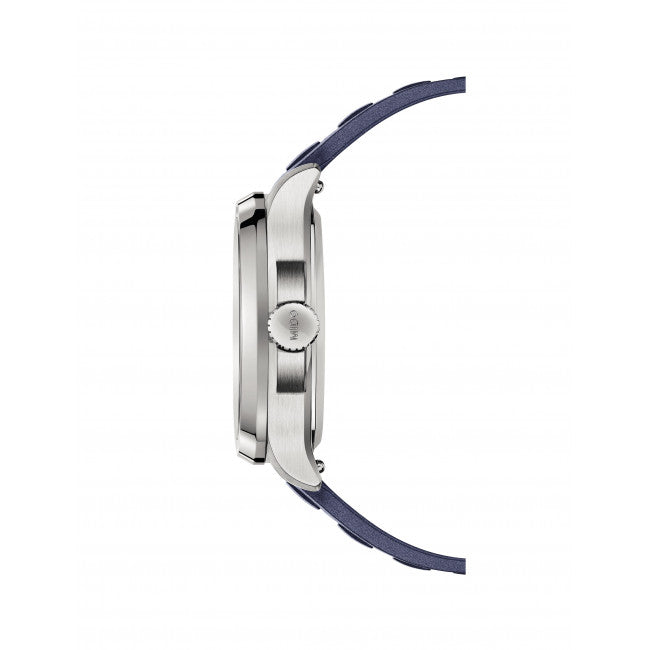 Il cinturino in gomma blu con fibbia ad ardiglione si abbina perfettamente alla tonalità del quadrante, rendendolo un perfetto orologio con cinturino blu adatto sia a look sportivi che a contesti più formali. Il vetro zaffiro con trattamento antiriflesso su entrambi i lati garantisce una visibilità eccellente in qualsiasi condizione di luce, mentre la struttura solida con corona e fondello a vite offre un’impermeabilità fino a 10 bar (100 metri).