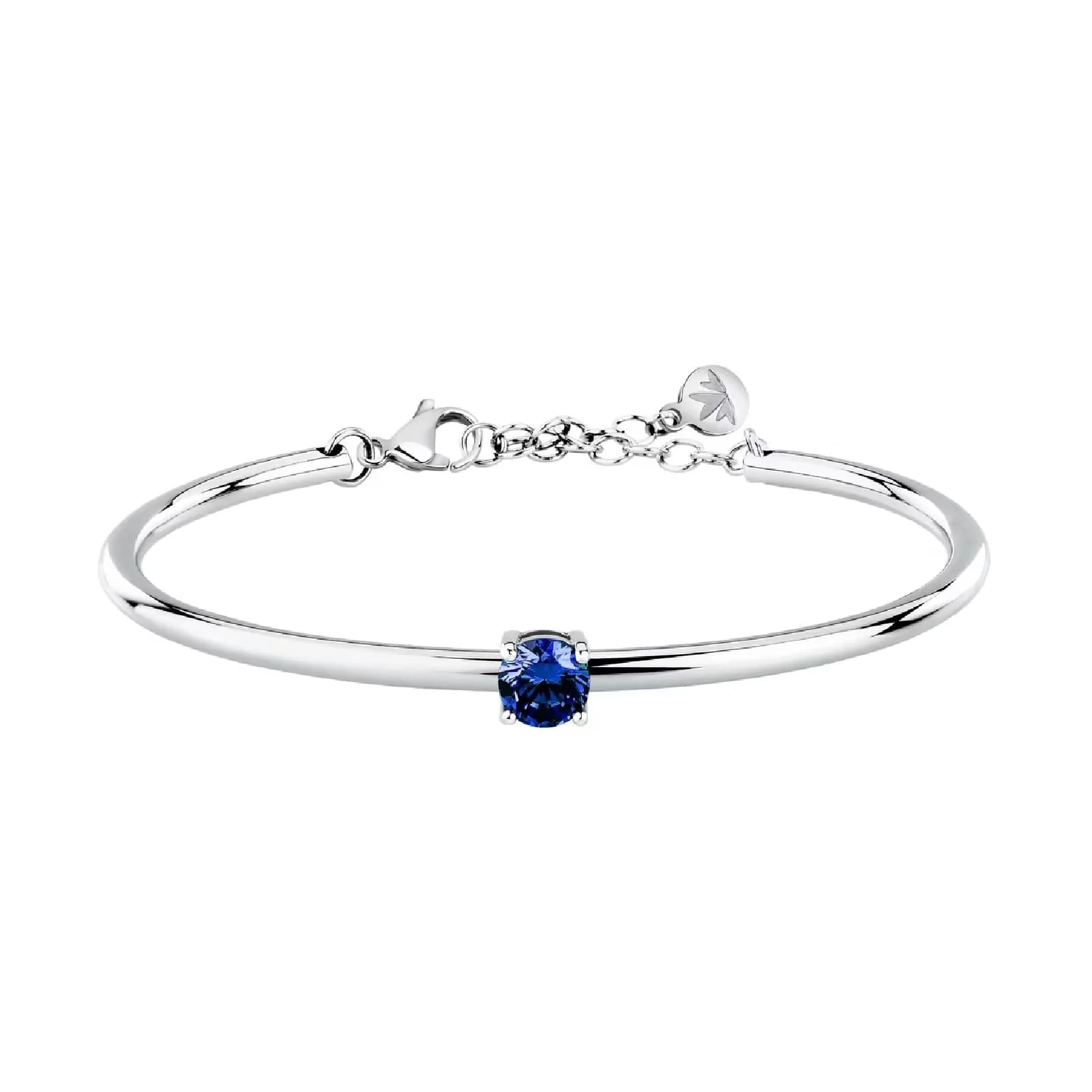 Il punto focale del gioiello è il suo elemento centrale: un cerchio impreziosito da zirconi blu, che regalano riflessi intensi e profondi. Questo contrasto cromatico con la finitura silver conferisce carattere al bracciale, rendendolo adatto sia al quotidiano che a occasioni speciali. Grazie alla sua versatilità, è il perfetto alleato per chi cerca un gioiello capace di valorizzare con naturalezza ogni look.