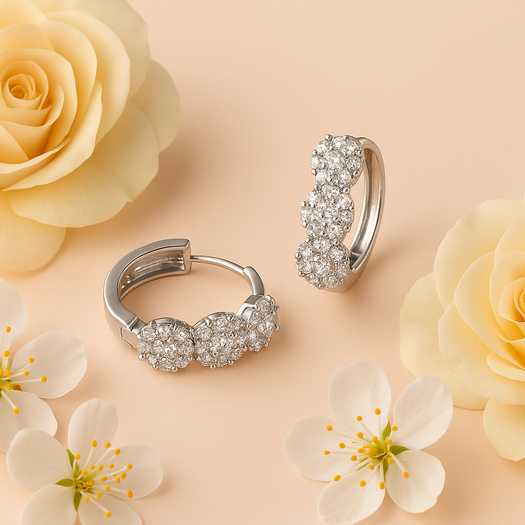 Realizzati in argento 925 rodiato, questi orecchini presentano un design elegante a cerchio con tre cluster di zirconi, dove la pietra centrale leggermente più grande crea un punto luce intenso e armonioso. Le pietre laterali, finemente incastonate, esaltano la luminosità complessiva, riflettendo la luce ad ogni movimento.