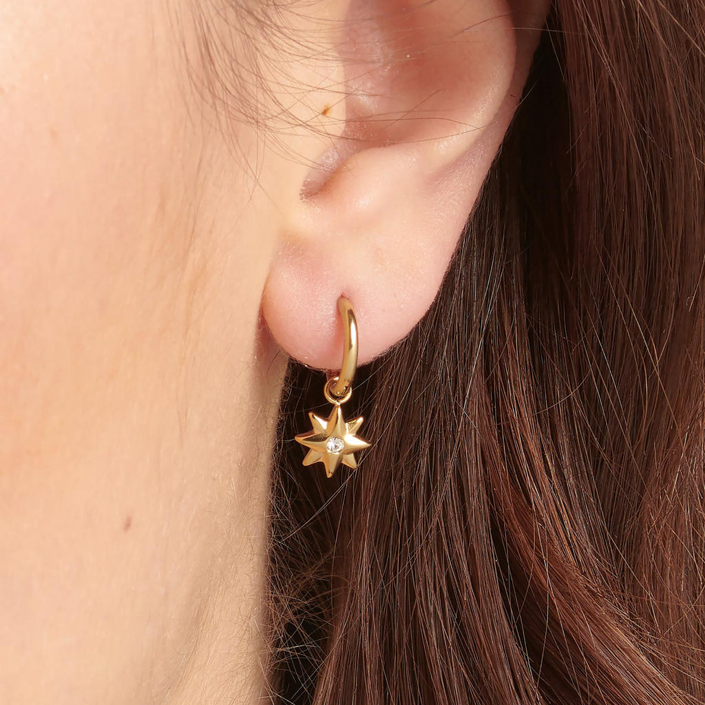 Orecchino singolo da donna di Brosway della collezione di Chakra. Gioiello realizzato in acciaio 316L e pvd oro con stella e cristallo crystal. Dimensione: 16 mm. La referenza è BHKE132