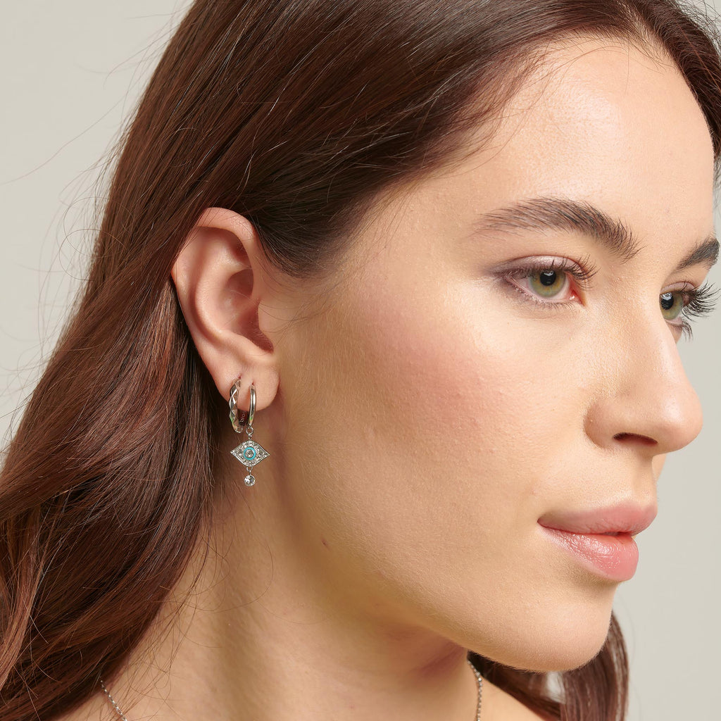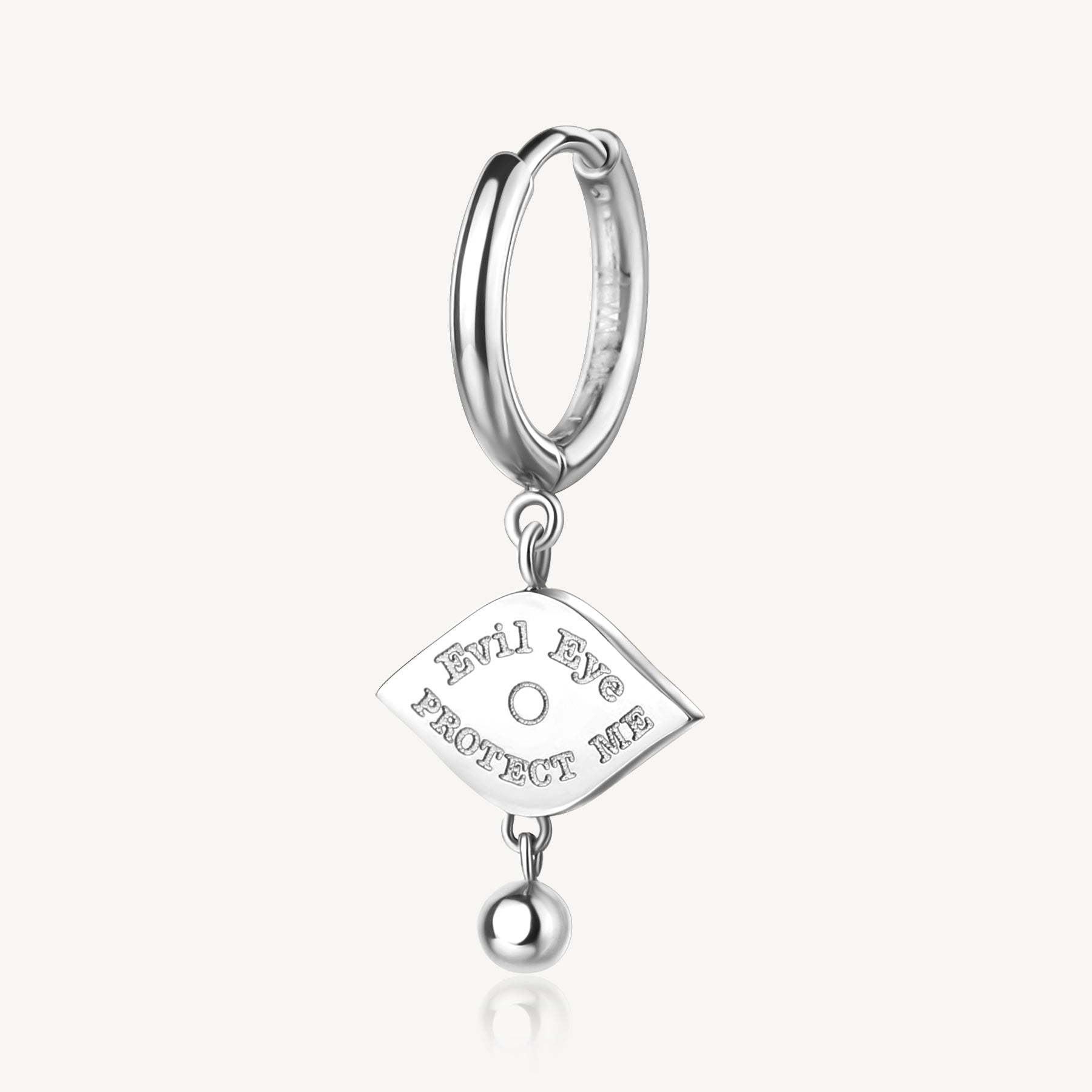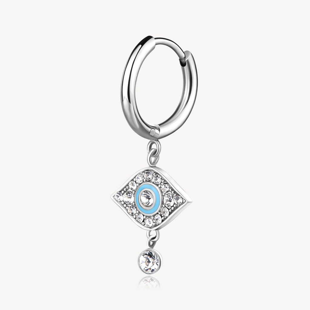Il pendente a forma di occhio, impreziosito da cristalli e smalto celeste, si fa notare con eleganza e discrezione. Un dettaglio che rende unico questo gioiello è l’incisione sul retro: Evil Eye protect me, che aggiunge un valore simbolico ancora più profondo e lo trasforma in un amuleto personale da indossare con intenzione. Questo orecchino singolo occhio è perfetto per chi ama i look asimmetrici e desidera creare combinazioni originali e significative con altri gioielli.