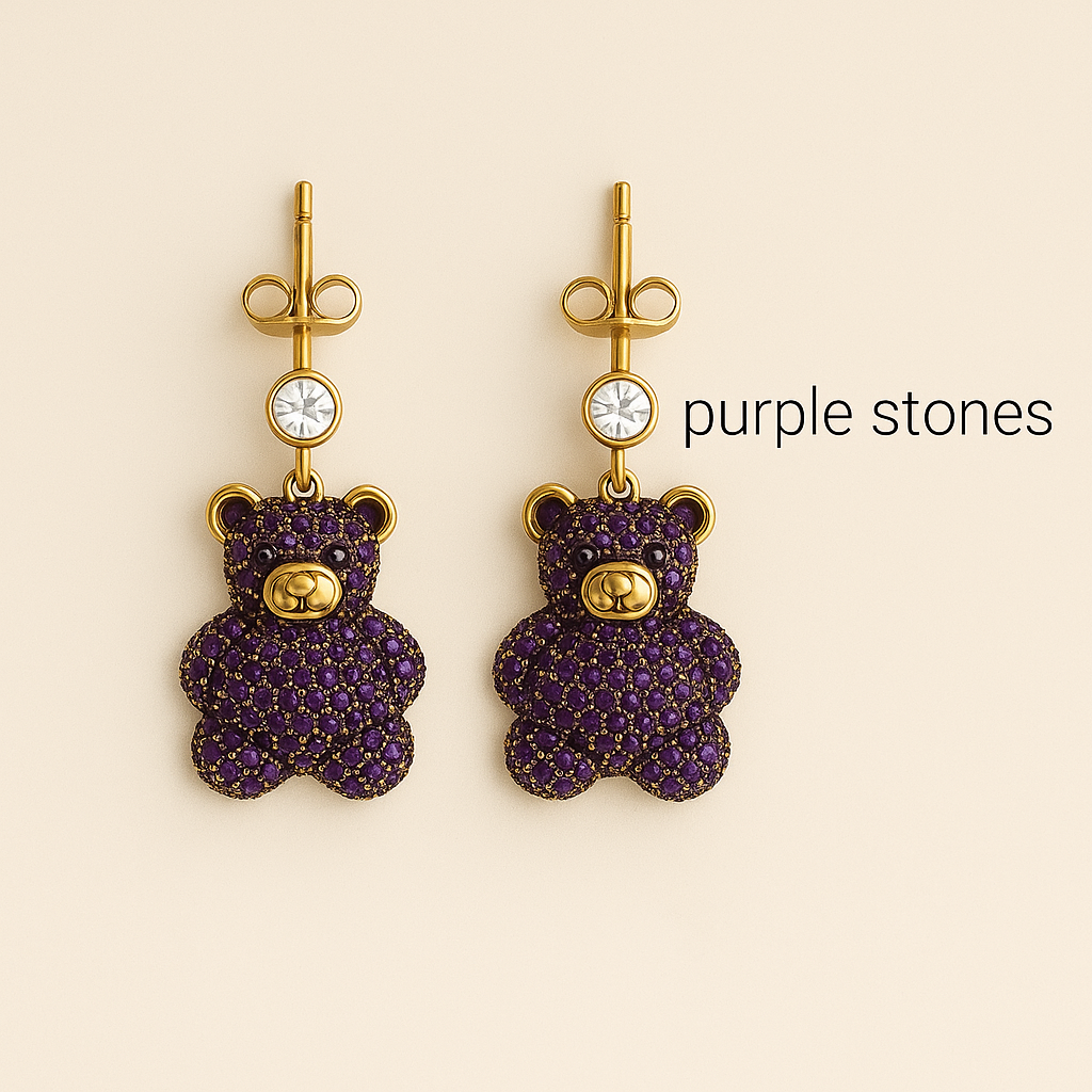 Questi orecchini pendenti a forma di orsetto sono realizzati in acciaio inox dorato e ricoperti da pietre viola luminose, che donano un tocco sofisticato e trendy.