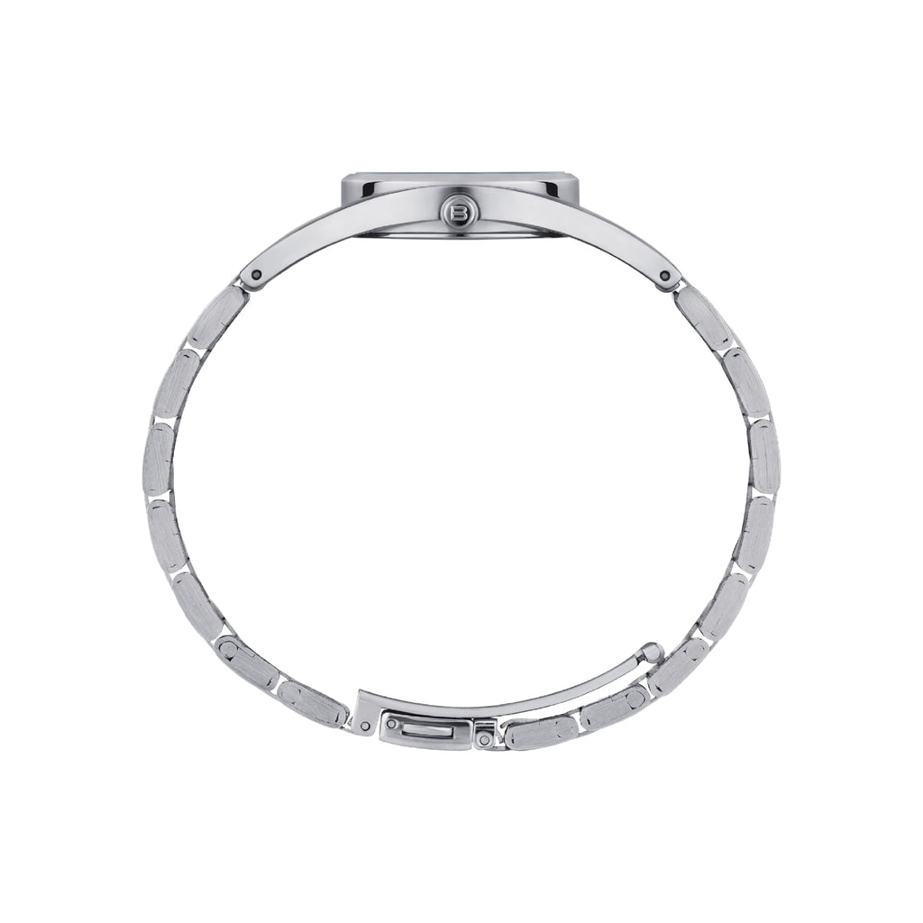 La cassa in acciaio lucido, smussata e dalla forma sinuosa, è un concentrato di equilibrio e precisione. Al suo interno si apre un quadrante argento con effetto sunray, l’unico vezzo cromatico di un design rigoroso, pensato per catturare la luce in modo delicato e sofisticato. Il profilo del quadrante è essenziale, con due sole lancette che enfatizzano lo stile minimal ed elegante.