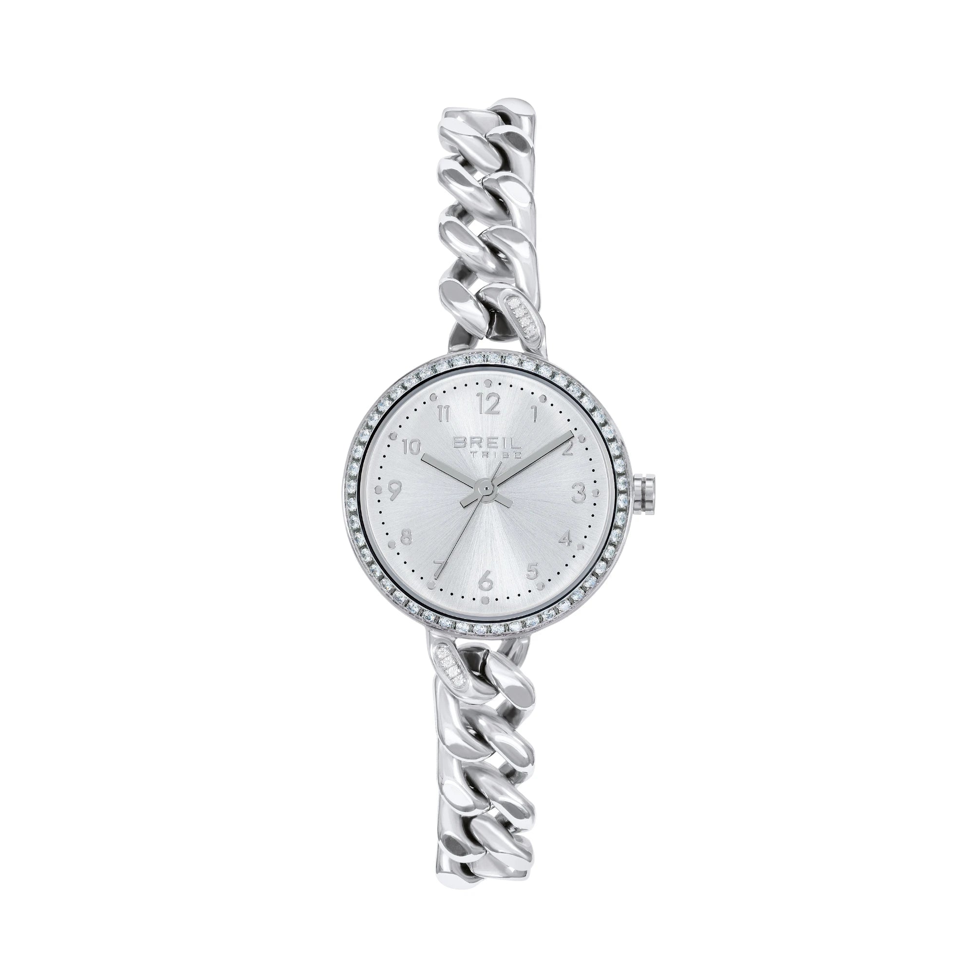 La cassa rotonda in acciaio lucido, compatta e discreta, incornicia un quadrante silver dalle linee sobrie ma luminose. Gli indici delicati sono arricchiti da cristalli, che aggiungono un tocco brillante e femminile. È un modello che si distingue per l’equilibrio tra semplicità e charme, pensato per chi ama uno stile minimal ma di carattere.