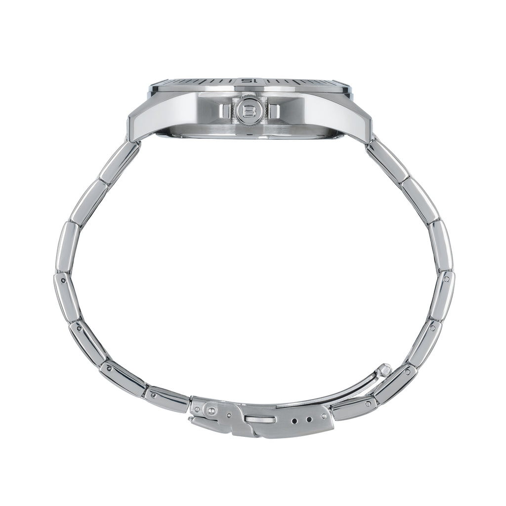 La cassa da 42 mm in acciaio inox si unisce armoniosamente al bracciale in acciaio con finitura bilux (lucida e satinata), per un look sobrio ma estremamente distintivo. Il peso equilibrato di 145 g garantisce una vestibilità stabile e confortevole, mentre la resistenza all’acqua fino a 50 metri lo rende adatto alla vita quotidiana e al tempo libero.
