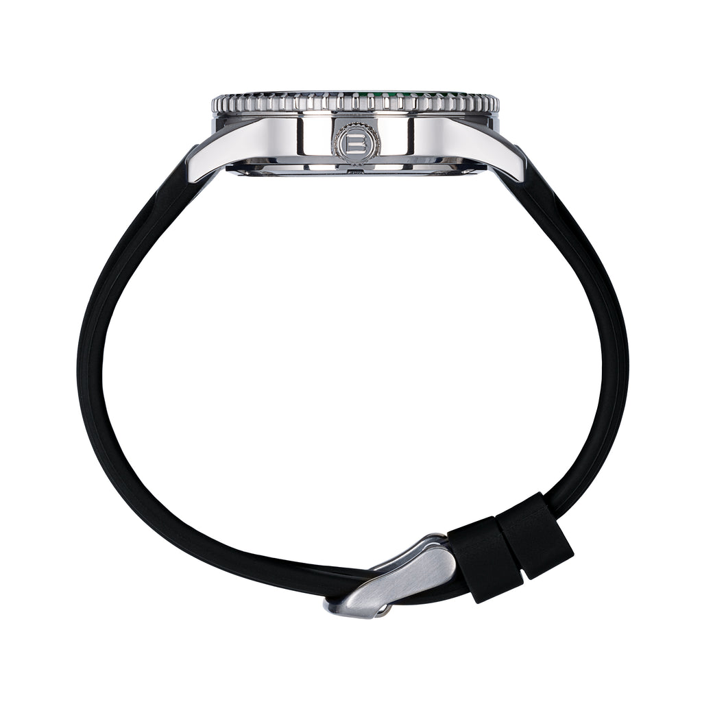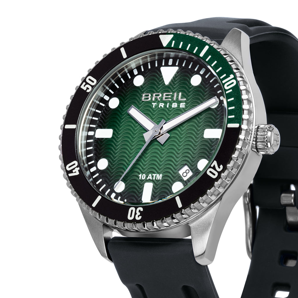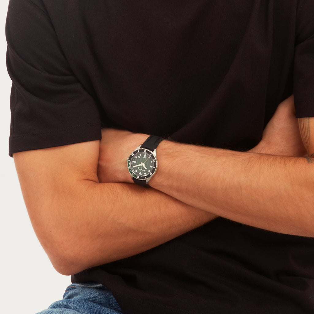 La cassa da 39 mm e il cinturino in silicone nero si combinano con un quadrante verde galactic caratterizzato da un elegante effetto sfumato, che aggiunge profondità e carattere al design. Gli indici bianchi a contrasto garantiscono massima leggibilità in ogni situazione. La lunetta bicolore nero e verde foresta completa il look, richiamando l’atmosfera naturale e potente del mare.