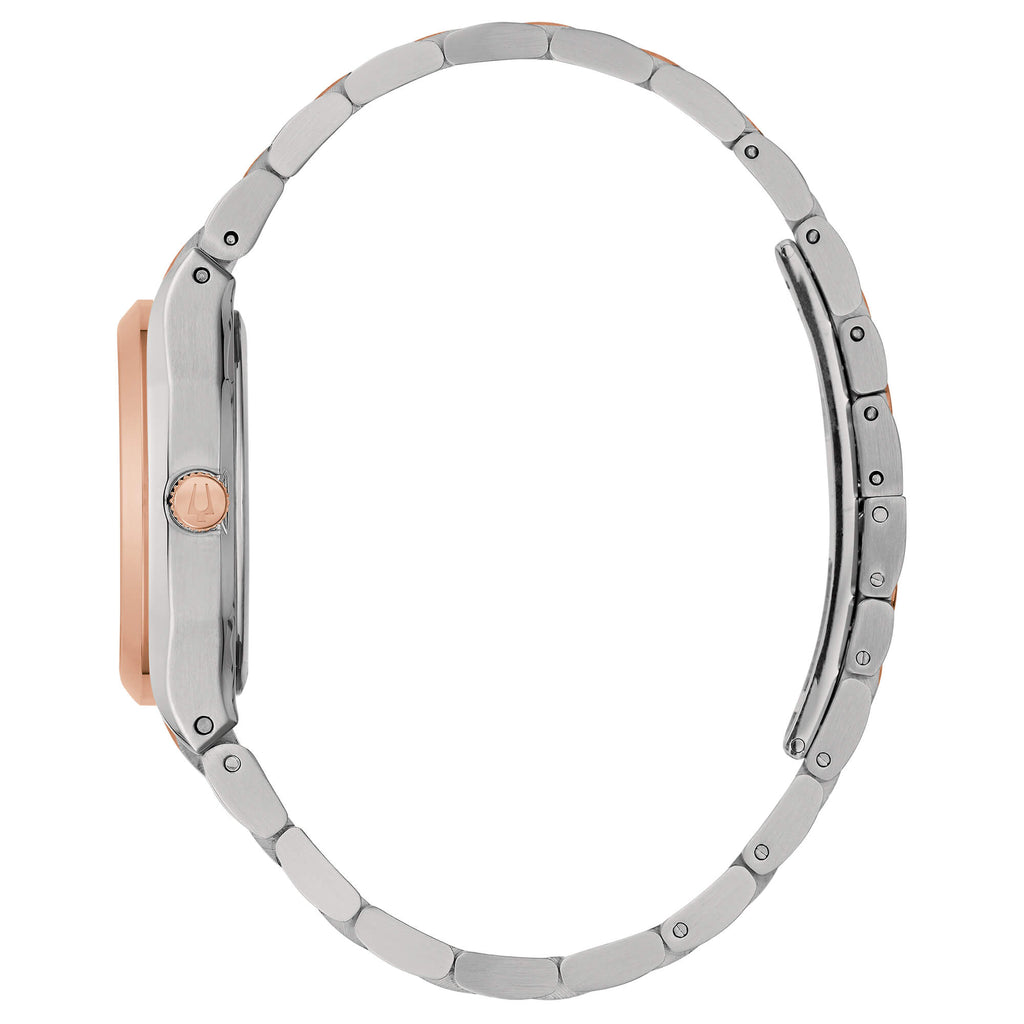 L’Orologio Surveyor Lady Bulova è un segnatempo pensato per la donna che ama distinguersi con eleganza e personalità. La sua cassa in acciaio bicolore, oro e acciaio, dal diametro di 34 mm e spessore di 10 mm, dona un carattere deciso senza rinunciare alla femminilità. Il quadrante in madreperla, arricchito da dettagli con diamanti, conferisce luce e un tocco di lusso discreto.