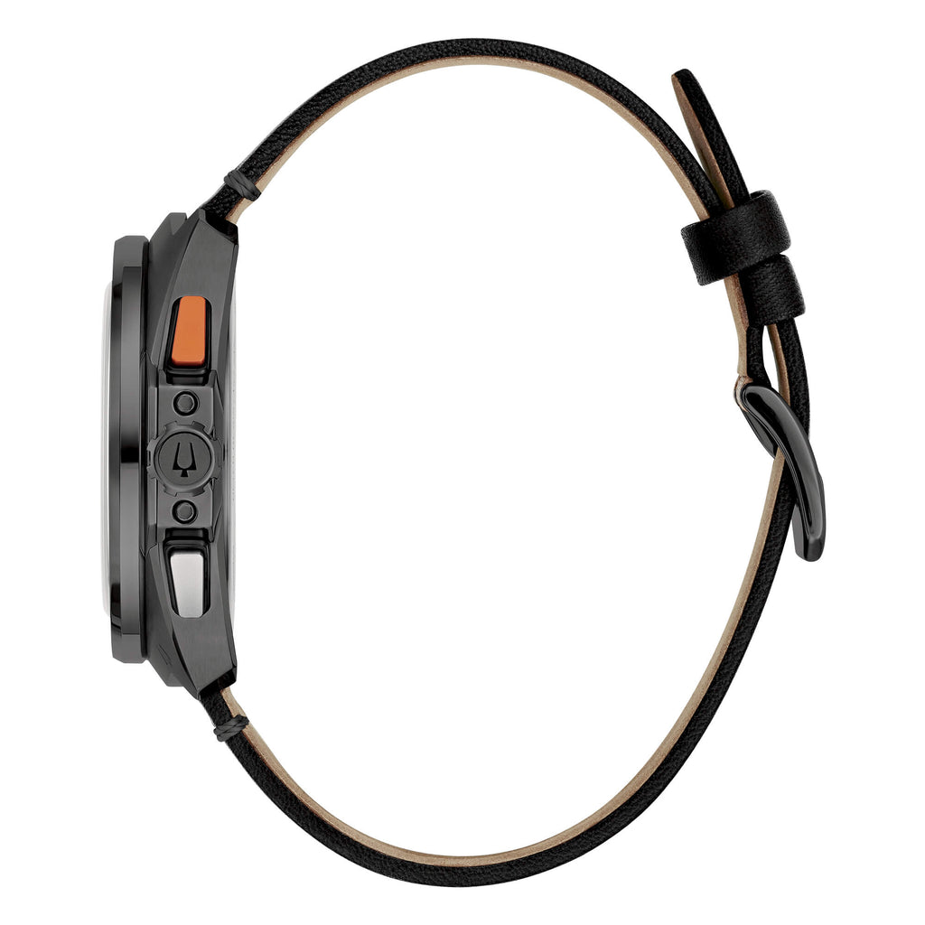 Il cinturino in pelle nera, robusto e confortevole, si adatta con facilità al polso, assicurato da una chiusura deployante che combina sicurezza e praticità. Con i suoi 100 grammi, il Bulova Racer è ben bilanciato e piacevole da indossare tutto il giorno, anche con outfit sportivi o casual eleganti.