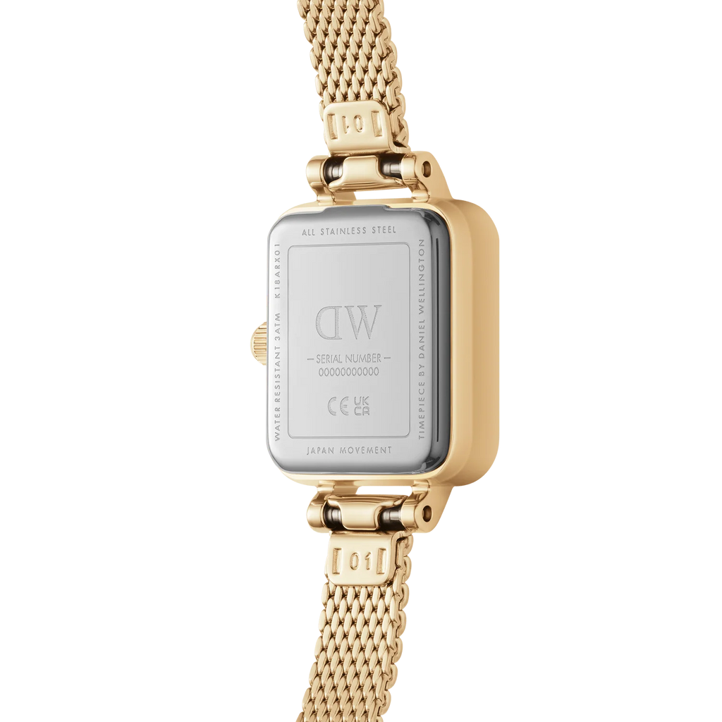La cassa rettangolare in acciaio inox 316L color oro, dallo spessore ultra sottile di 6 mm, è pensata per accompagnare con discrezione ogni gesto, fondendosi con naturalezza sul polso. Il quadrante bianco si abbina perfettamente al cinturino in maglia milanese color oro, largo appena 6 mm, per un effetto gioiello che aggiunge luce e stile a qualsiasi outfit.