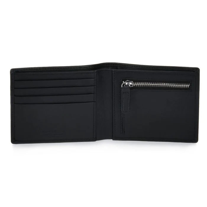 Il Portafoglio John Richmond è realizzato in ecopelle. All'interno ha un comparto per le banconote, 4 slot per carte di credito, tessere, documenti e una tasca con chiusura a zip per le monete metalliche. Sul fronte la lettering del brand