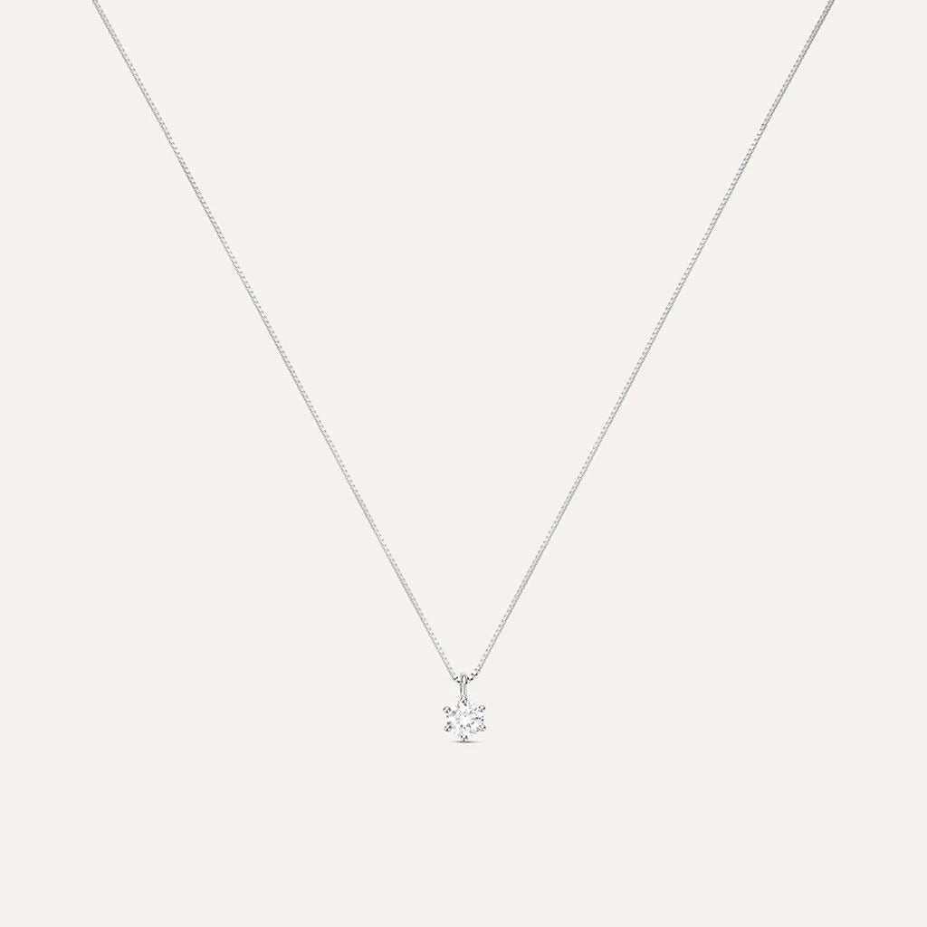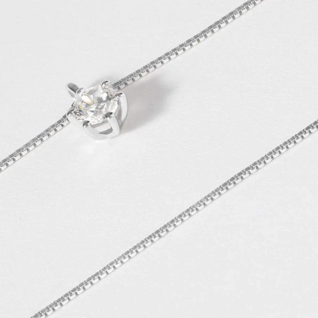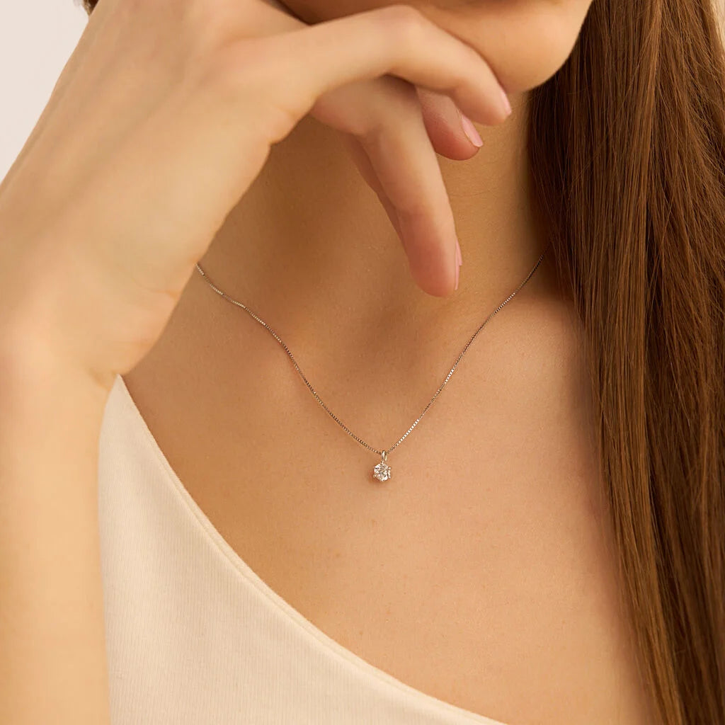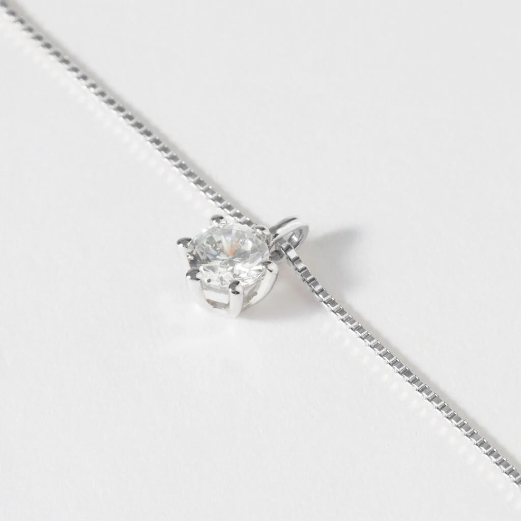 La pietra centrale è incastonata con una montatura a 6 griffe, scelta ideale per esaltarne la brillantezza senza comprometterne la sicurezza. Questo tipo di incastonatura, insieme al trattamento tradizionale del cubic zirconia, rende la collana un punto luce vero e proprio: piccolo, ma capace di catturare l’attenzione con ogni movimento. La chiusura ad anello a molla è pratica e sicura, ideale per un uso quotidiano.