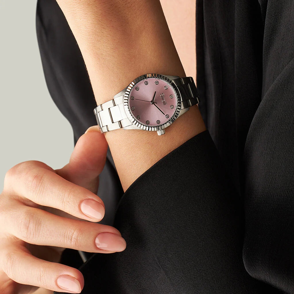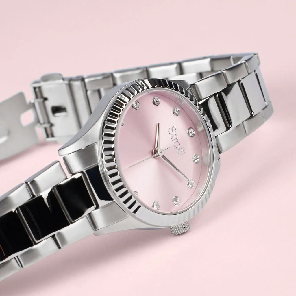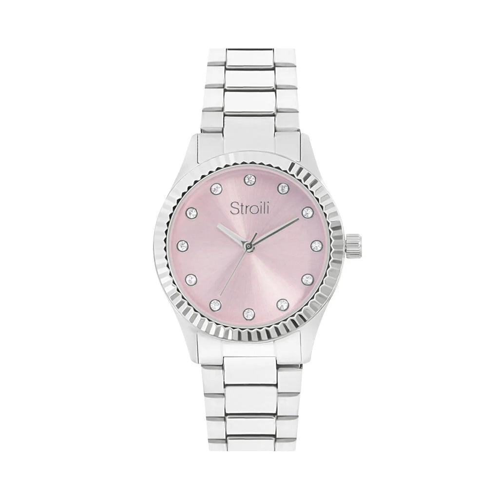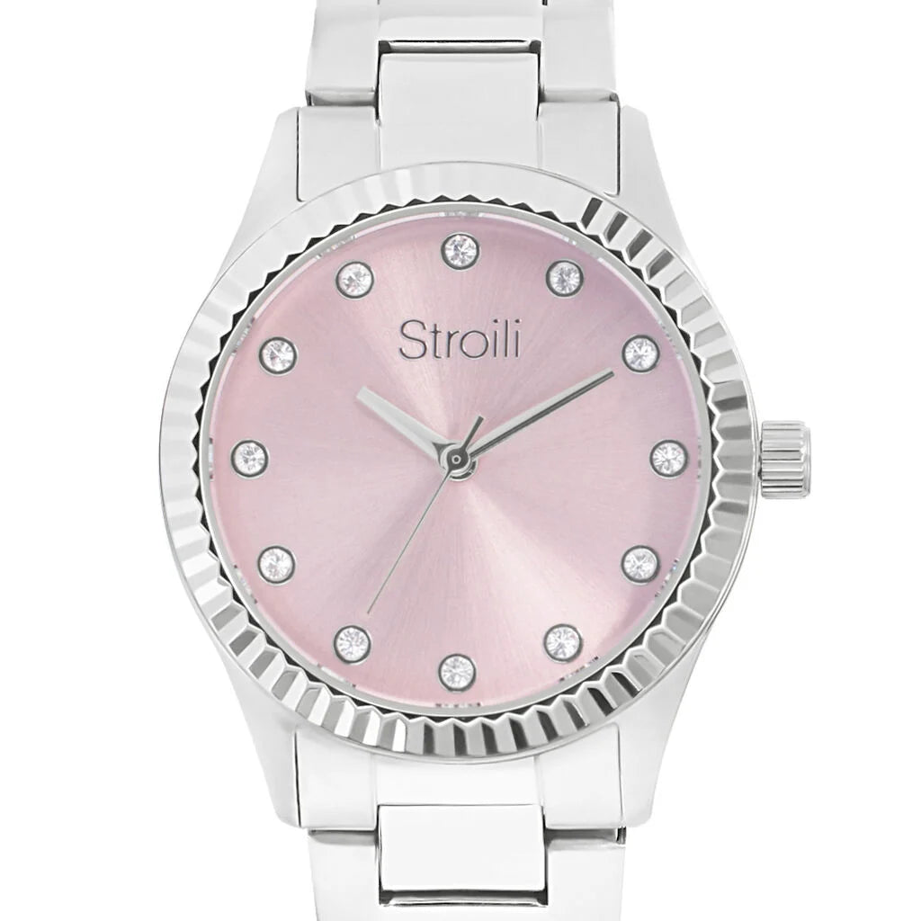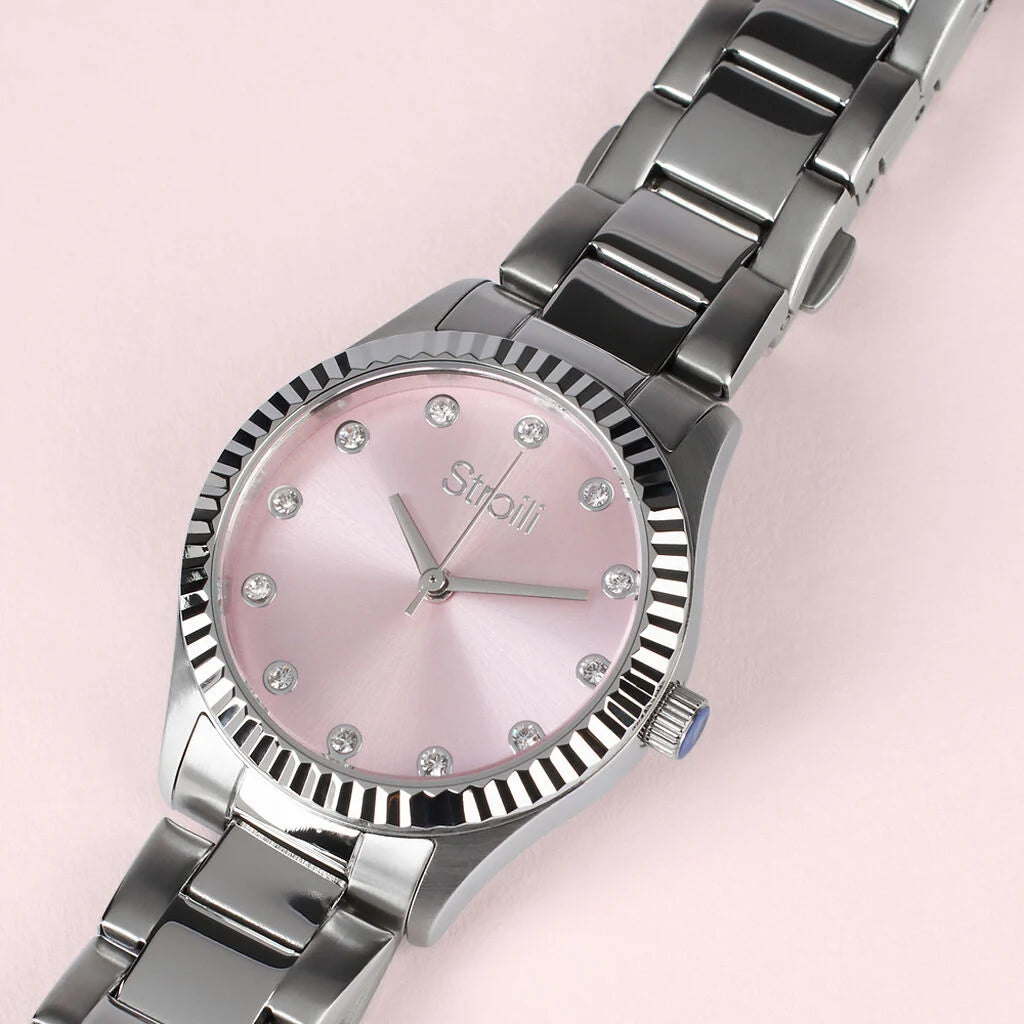 L’Orologio al Quarzo Stroili Positano è l’emblema della femminilità elegante firmata Stroili. Raffinato, luminoso e perfettamente bilanciato nelle proporzioni, è pensato per la donna che desidera un accessorio delicato ma di grande personalità. La cassa rotonda da 30 mm in acciaio argentato, con finitura liscia e profilo sottile (spessore 9 mm), si adatta con grazia a ogni tipo di polso. Il protagonista assoluto è il quadrante rosa, romantico e raffinato, impreziosito da 12 cristalli bianchi taglio brillante posizionati come indici, per un effetto gioiello sobrio ma d’impatto.