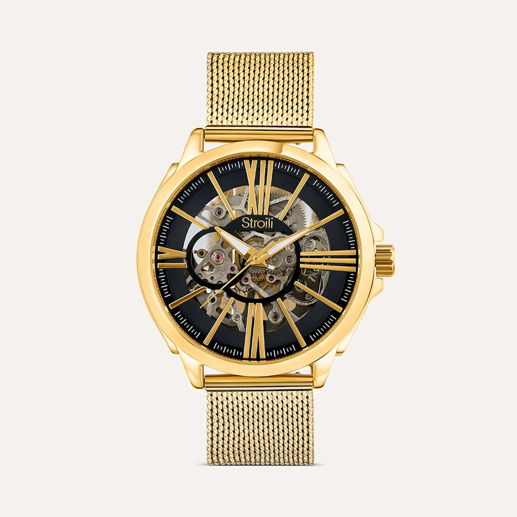 Orologio Automatico Stroili Montreux Cassa Rotonda Acciaio Dorato 43,8 mm Quadrante Nero Cinturino Acciaio Dorato