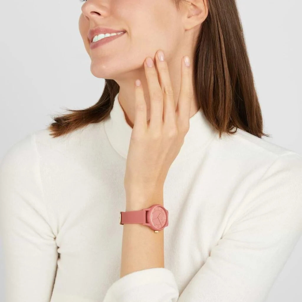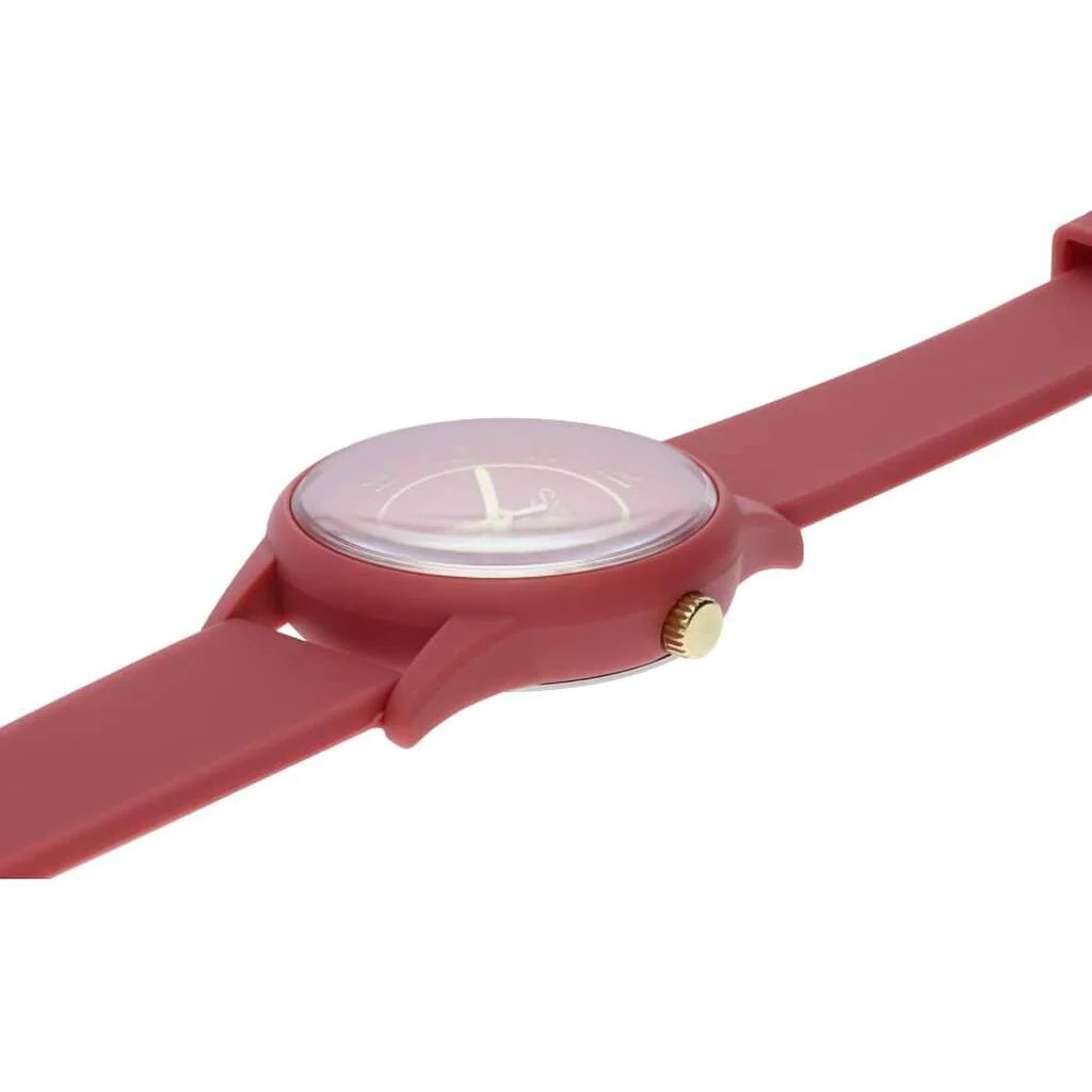 La cassa rotonda da 33 mm, realizzata in plastica con doppia finitura opaca e brillante, accoglie un quadrante rosso con numeri arabi e punti, ben visibili e facili da leggere. Il display analogico è chiaro e funzionale, progettato per chi cerca semplicità e immediatezza. Il cinturino in silicone rosso, morbido e liscio al tatto, assicura comfort assoluto e aderenza perfetta al polso, anche nelle giornate più dinamiche.