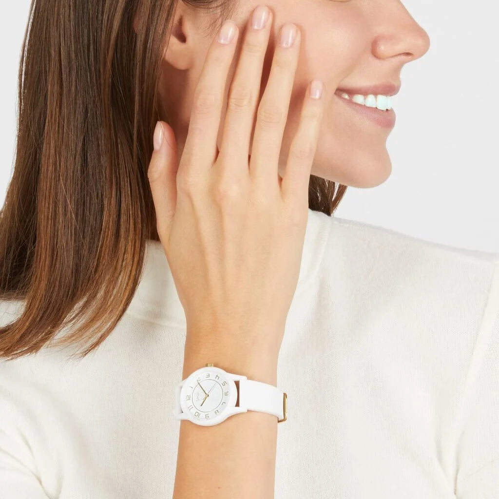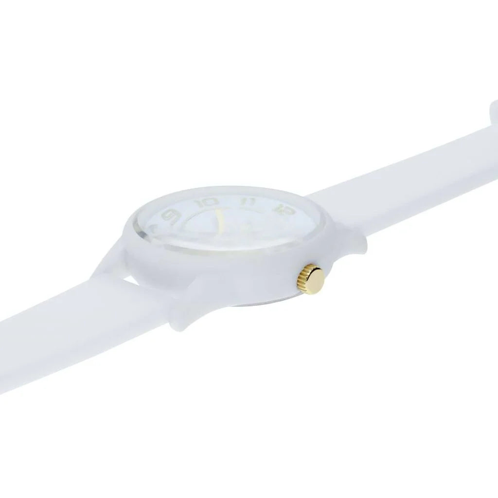 La cassa rotonda da 33 mm in plastica bianca opaca e brillante ospita un quadrante analogico chiaro, pulito e facilmente leggibile, grazie alla presenza di numeri arabi ben visibili. Una scelta perfetta per chi cerca chiarezza e praticità, senza rinunciare allo stile. Il cinturino in silicone bianco, liscio e regolabile, assicura comfort durante tutta la giornata ed è facilmente intercambiabile, per chi ama personalizzare il proprio orologio in base all’occasione.